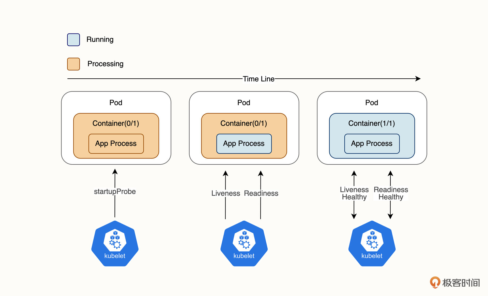 不过要注意的是,当业务进程还处于启动过程时,Pod 和容器都处于 Running 状态,但由于业务并没有完成启动,所以还不具备接收外部流量的条件。