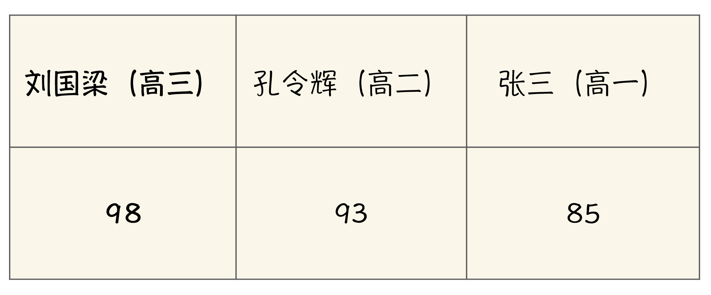 高一的时候张三战斗力 85,比他能力强的有两个人,一个是高二的孔令辉,战斗力 93,一个是高三的刘国梁,战斗力 98。那么此时,能代表学校参加比赛的只有最高战力的刘国梁。