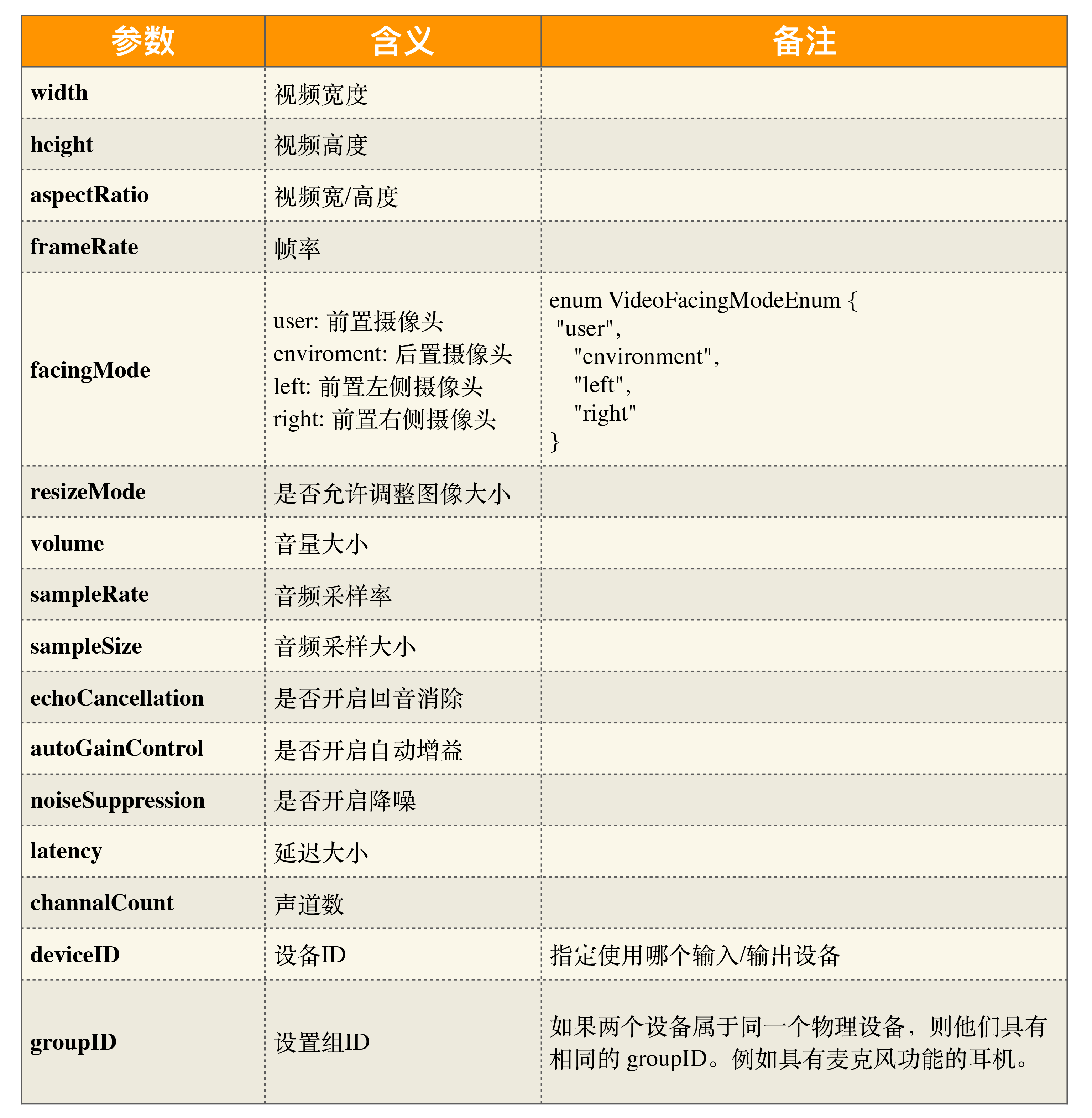 除了上面介绍的这些参数来控制摄像头和麦克风外,当然还有其他一些参数可以设置,更详细的参数信息,可以跳到下面的参考部分。