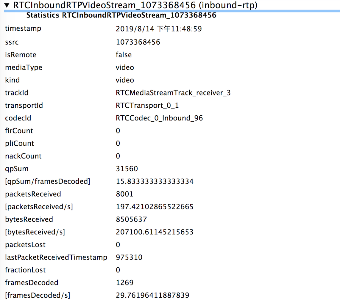 首先我们来看接收到的视频轨信息,在浏览器上点开 “…receiver_6(track)” 时,你就可以看到类似于下面这张图的内容: