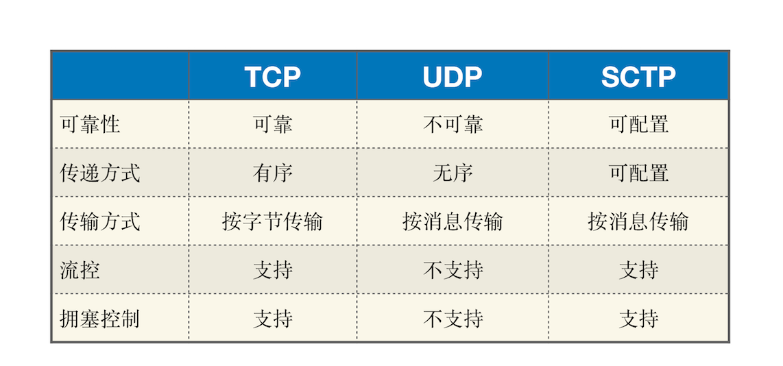 WebRTC 的 RTCDataChannel 使用的传输协议为 SCTP,即 Stream Control Transport Protocol。下面图表表示的就是在 TCP、UDP 及 SCTP等不同传输模式下,数据传输的可靠性、传递方式、流控等信息的对比: