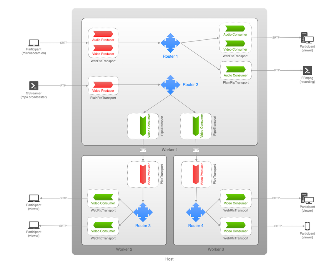Mediasoup 把每个实例称为一个 Worker,在 Worker 内部有多个 Router,每个 Router 相当于一个房间。在每个房间里可以有多个用户或称为参与人,每个参与人在Mediasoup中由一个 Transport代理。换句话说,对于房间(Router)来说,Transport 就相当于一个用户。