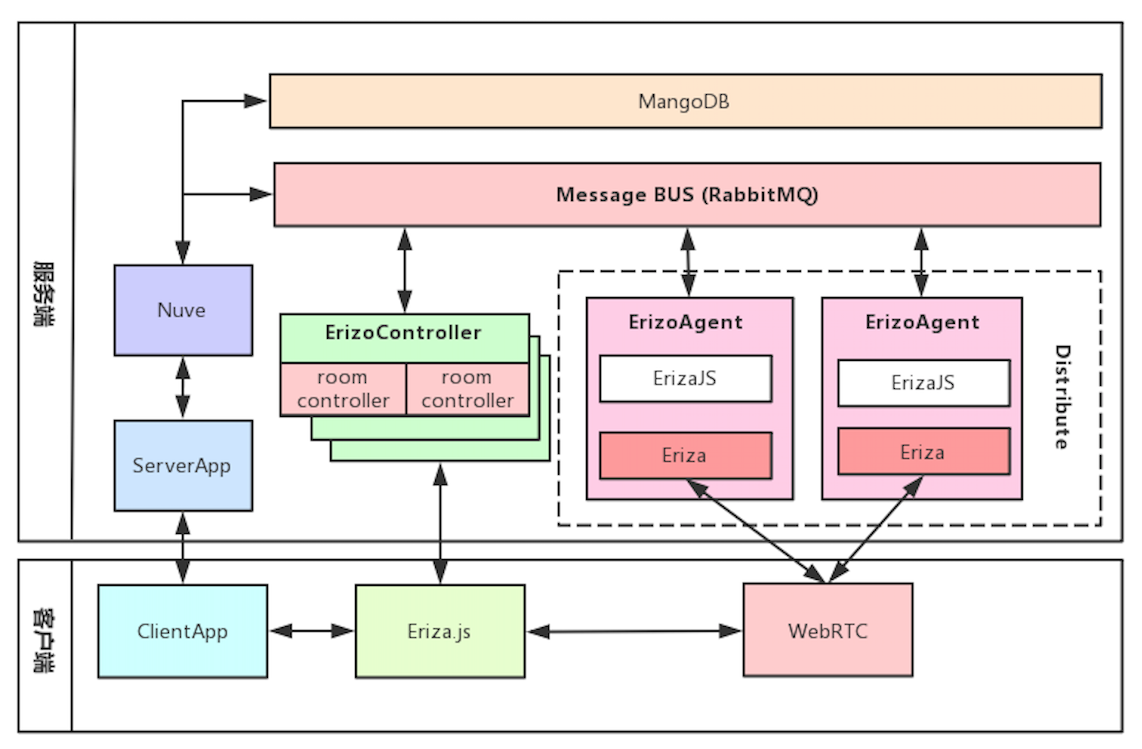 - ErizoController,用于管理控制,信令和非音视频数据都通过它接收。它通过消息队列与 Nuve进行通信,也就是说 Nuve 可以通过消息队列对 ErizoController 进行控制。