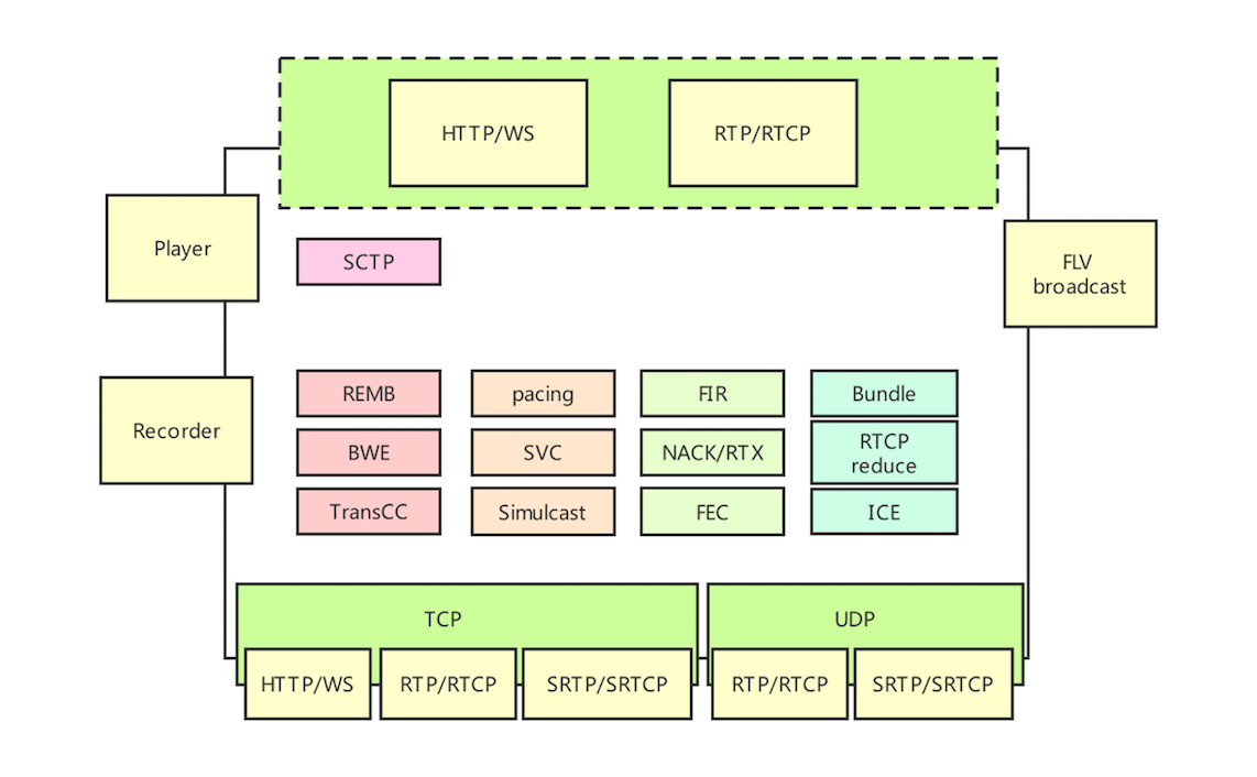 从大的方面来讲,Medooze 支持 RTP/RTCP、SRTP/SRCP 等相关协议,从而可以实现与 WebRTC终端进行互联。除此之外,Medooze还可以接入RTP流、RTMP流等,因此你可以使用GStreamer/FFmpeg向Medooze推流,这样进入到同一个房间的其他 WebRTC 终端就可以看到/听到由 GStream/FFmpeg 推送上来的音视频流了。另外,Medooze 还支持录制功能,即上图中的 Recorder 模块的作用,可以通过它将房间内的音视频流录制下来,以便后期回放。