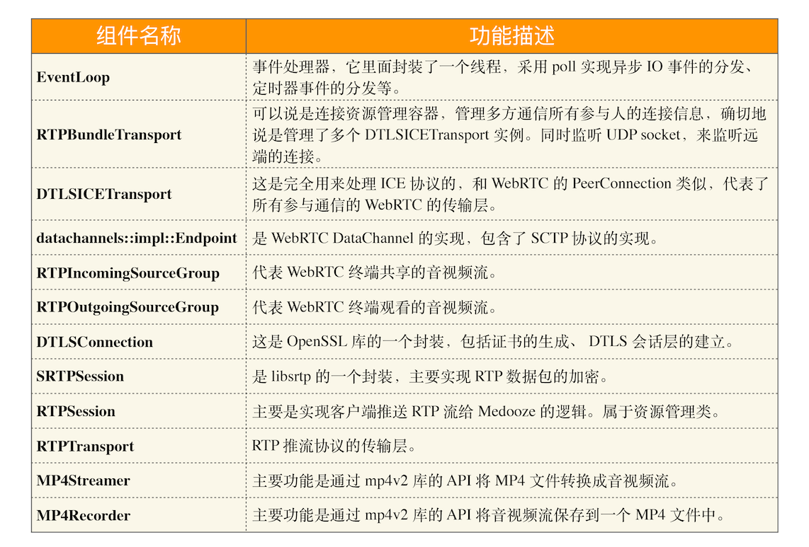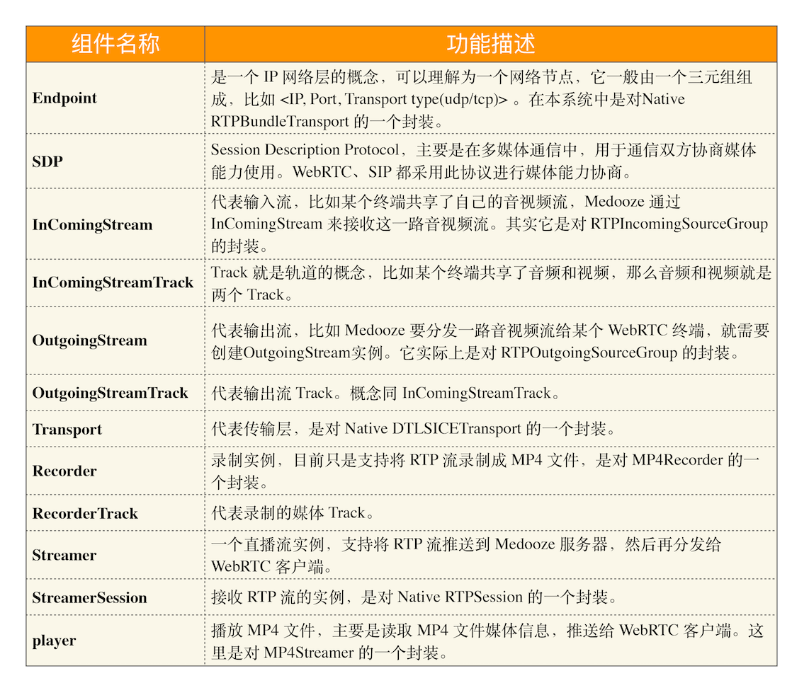 了解了 Media server node 组件中的模块后,接下来我们再来看看 Media server 组件中每个模块的作用,说明如下: