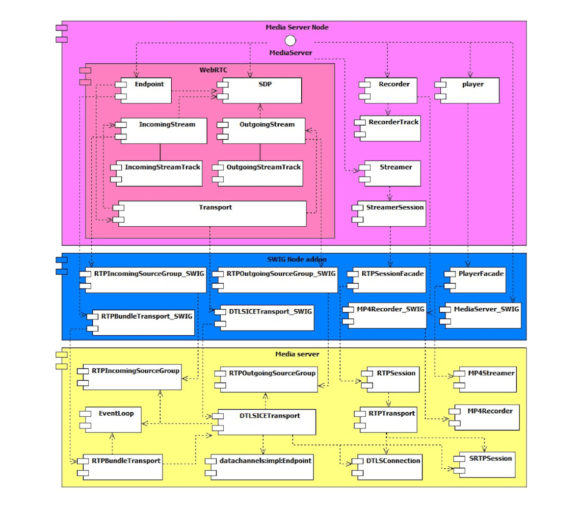 需要注意的是,上图中的每一个组件基本是一个 Node.js 模块或者是一个 C++ 类,也有极个别组件是代表了几个类或者模块,比如SDP 其实是代表整个 SDP 协议的实现模块。