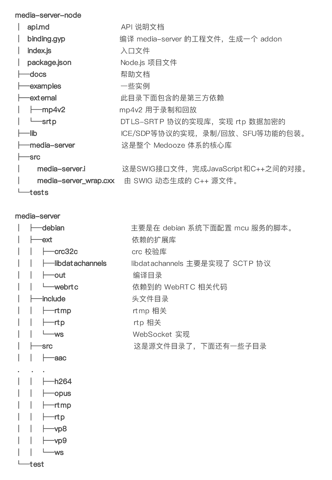 这里我们对 media-server-node 源码目录结构做一个简要的说明,一方面是给你一个大概的介绍,另一方面也做一个铺垫,便于我们后续的分析。
