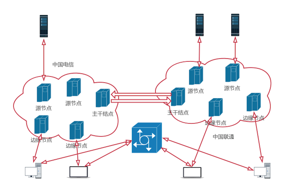 CDN 网络的构造十分复杂(如下图所示),一般情况下,它先在各运营商内构建云服务,然后再将不同运营商的云服务通过光纤连接起来,从而实现跨运营商的全网CDN云服务。