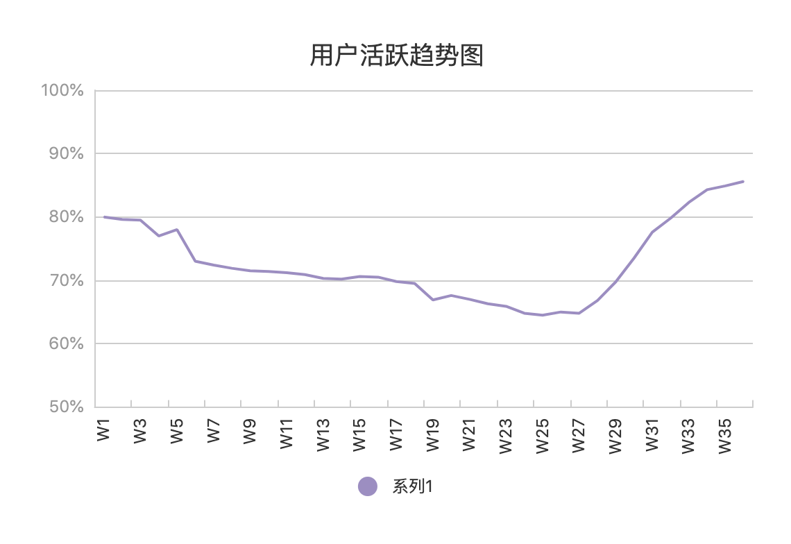 差不多过了半年时间,相关的主要功能已经基本都上线了。但通过对数据的跟进,我们发现,与试运行相比,我们的周活跃率却一直是一个下降趋势,半年的时间已经下降到了65%左右。