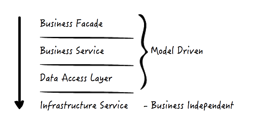 在这种划分方式下,每一层都可以调用自身所属层上的其它类,也可以调用自己下方一层的类,但是不允许往上调用,即依赖关系总是“靠上面的层”依赖着“靠下面的层”。最上面三层是和业务模型实体相关的,而最下面一层是基础设施服务,和业务无关。从上到下,我把各层依次简单介绍一下: