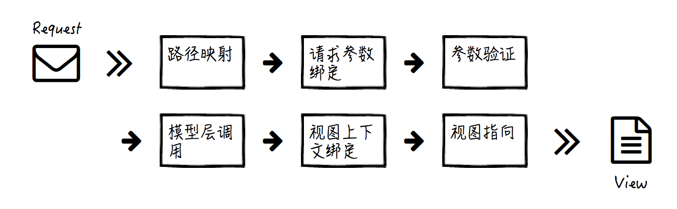 随着请求到达控制器,让我们顺着接下去的请求处理流程,看看控制器会通过怎样的步骤,履行完它的职责,并最终转到相应的视图吧。