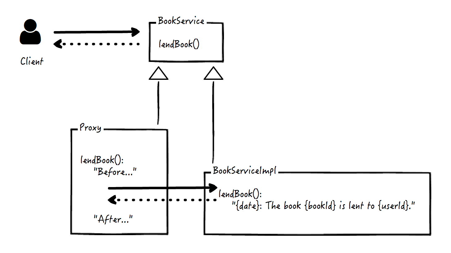 你看,我们创建了一个动态代理对象,并赋给 bookService,这个代理对象实际是会调用 BookServiceImpl 的,但调用的前后打印了额外的日志。并且,这个代理对象也实现自 BookService 接口,因此,对于 BookService 的使用者来说,它实际并不知道调用到的是 BookServiceImpl 还是它的代理对象。请看图示: