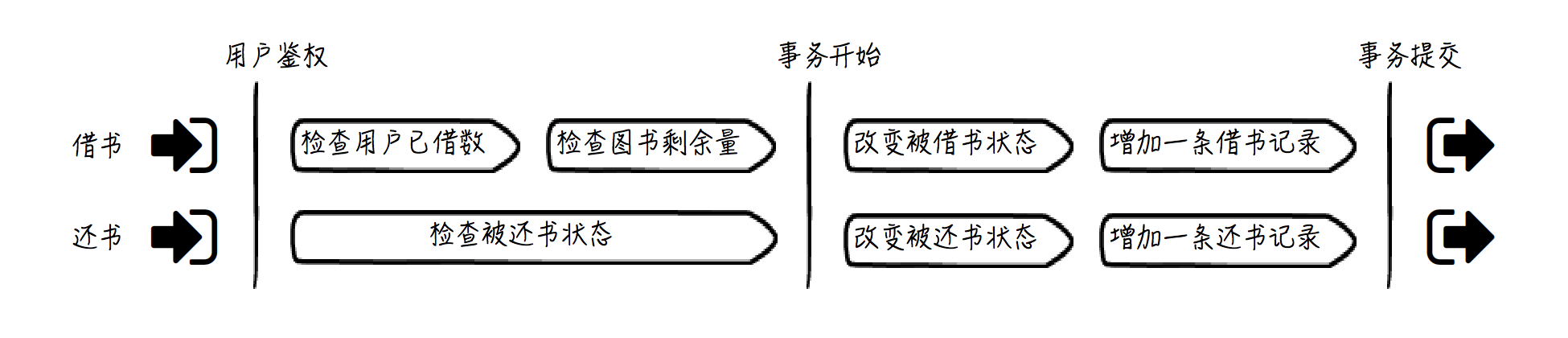 我们来看下面这样一个例子,对于图书馆系统来说,有许多业务流程,其中借书和还书是最典型的两条。对于这些业务流程来说,从图书系统接收到请求开始,需要完成若干个步骤,但这些步骤都有一些“共性”,比如鉴权,比如事务控制: