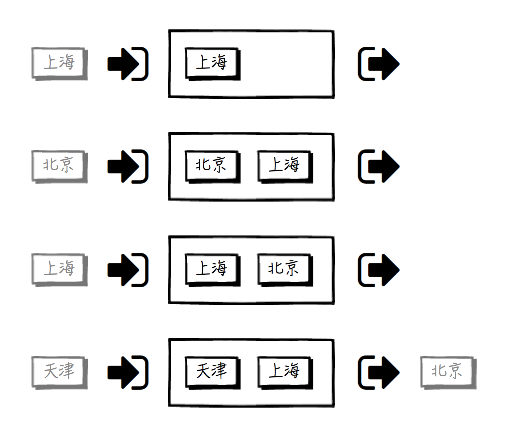 假设用这个缓存的 LRU 队列来存储城市信息,且队列容量只有 2。