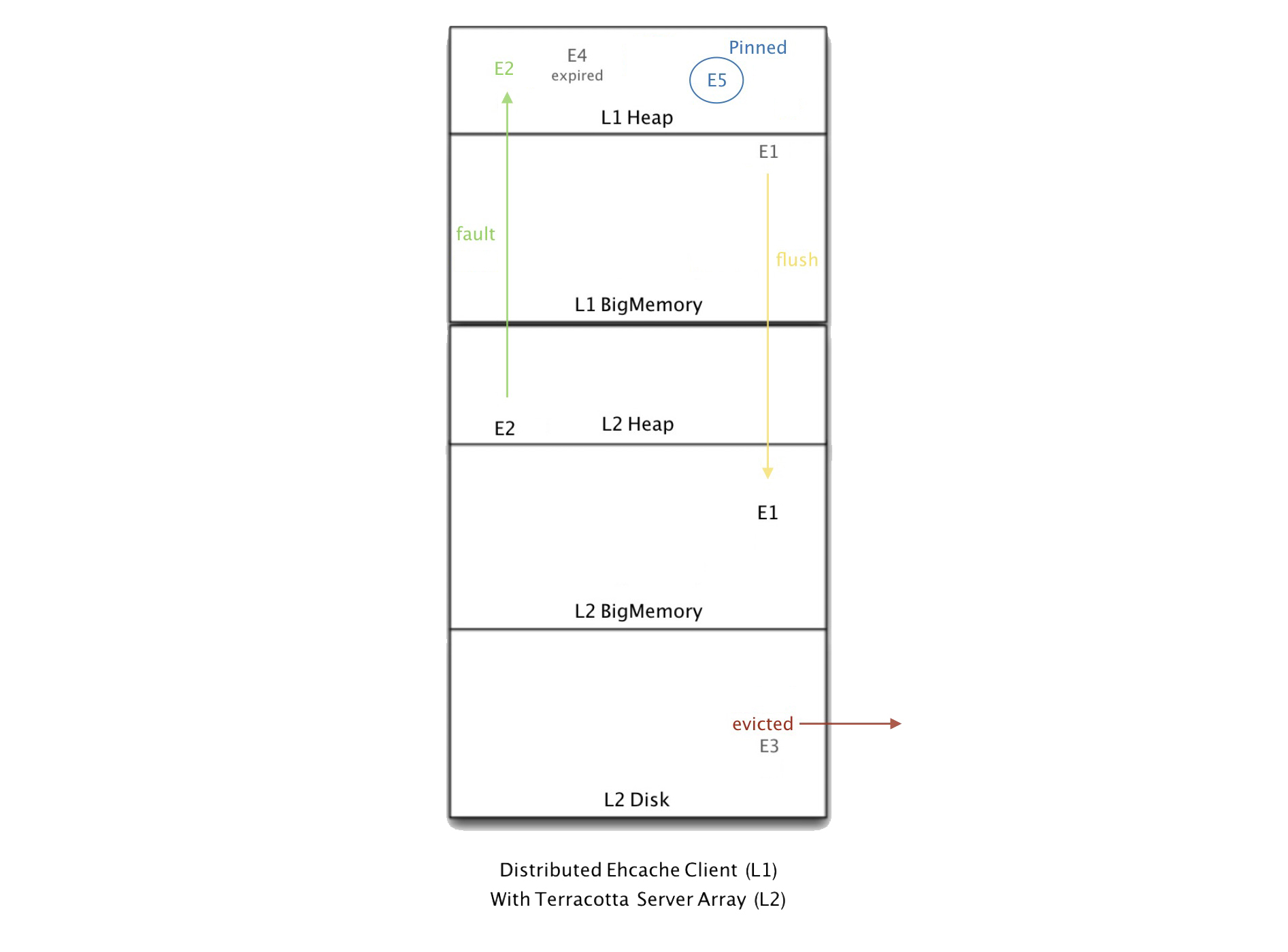 整个容器是分层的,从上到下分别为 L1 Heap、L1 BigMemory、L2 Heap、L2 BigMemory 和 L2 Disk,级别依次降低。这里面定义了几种不同的行为,来反映数据的流动: