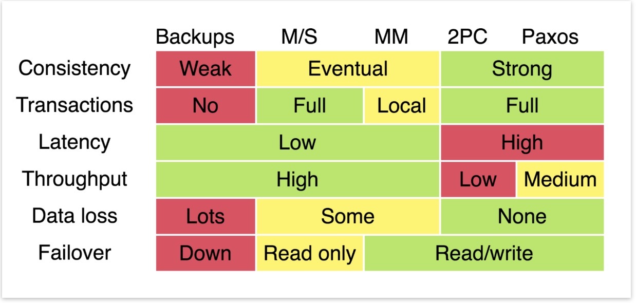 从中我们可以看到,没有一列能够做到全绿色,这正如我们所知道的那样,软件工程上的问题都“没有银弹”。特别是,Backups、M/S 和 MM 得益于异步的副本拷贝,能够做到低延迟,这就无法做到强一致性;而 2PC 和 Paxos 通过同步操作可以做到强一致性,却带来了高延迟。
