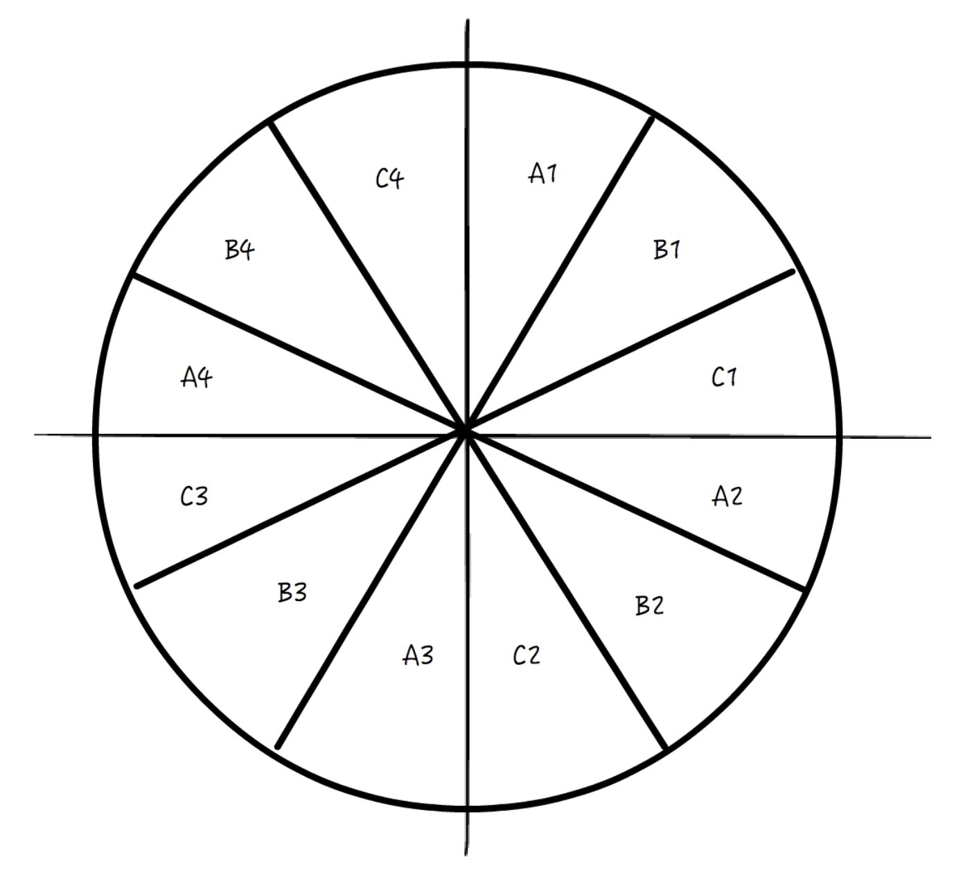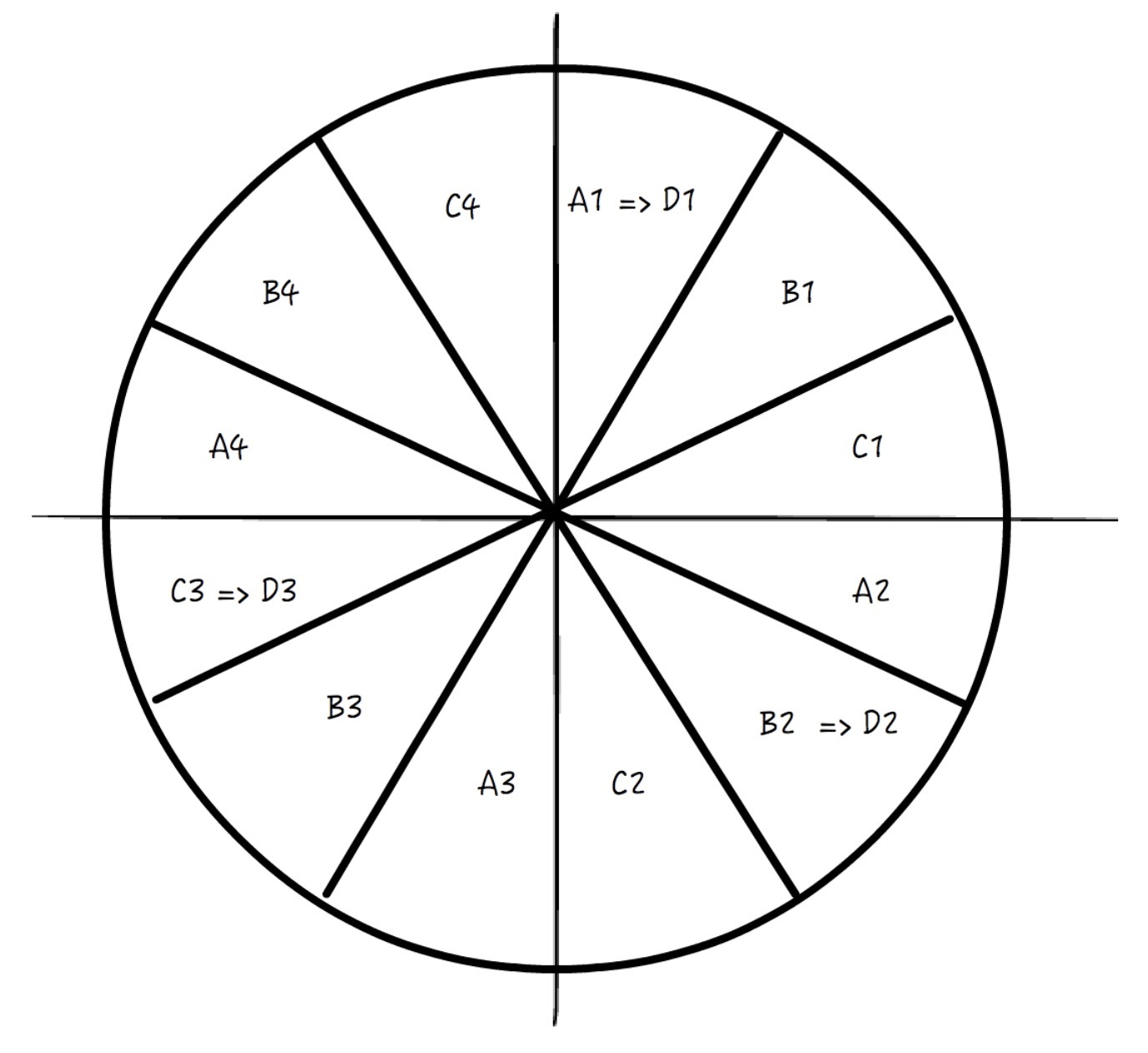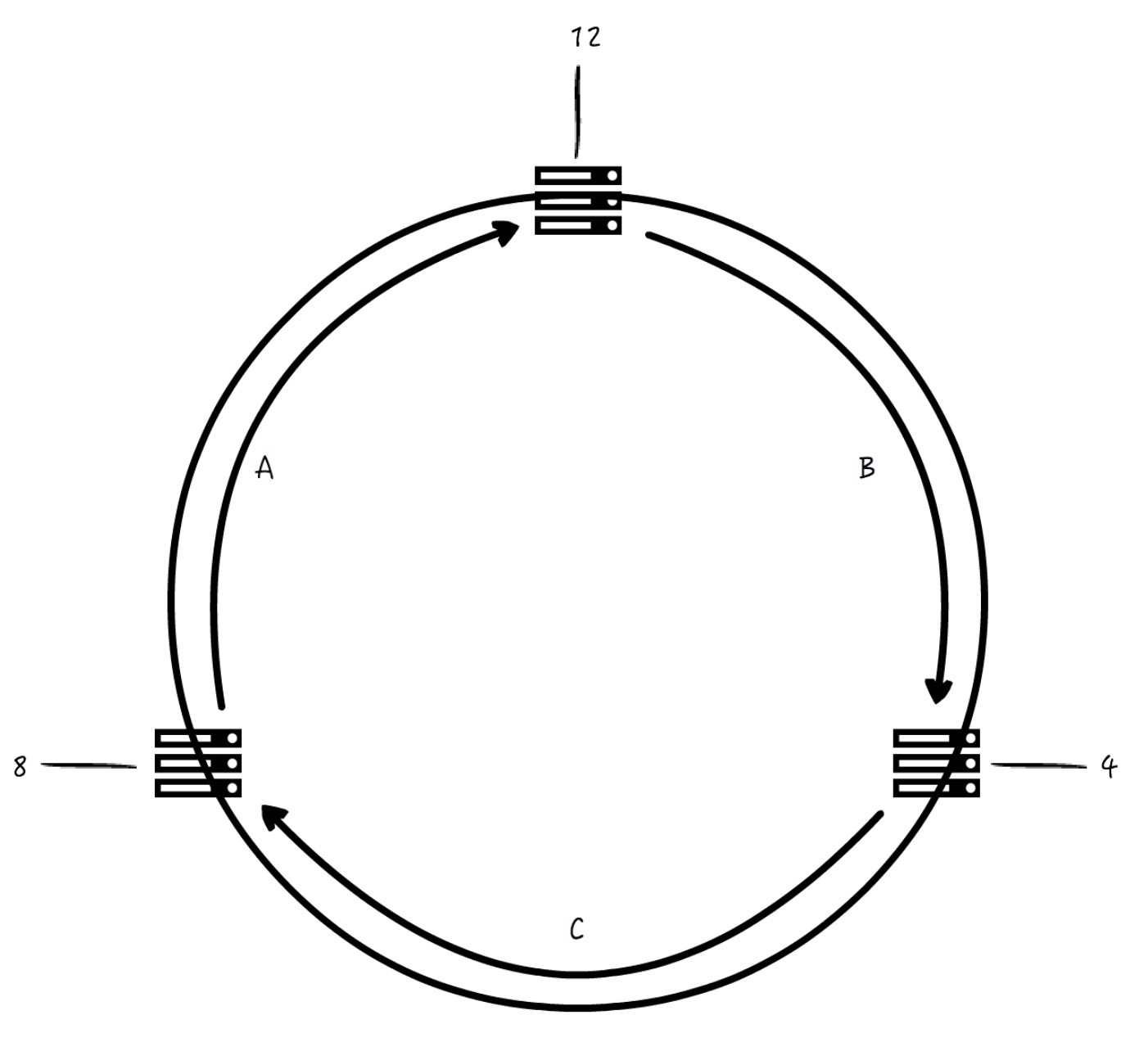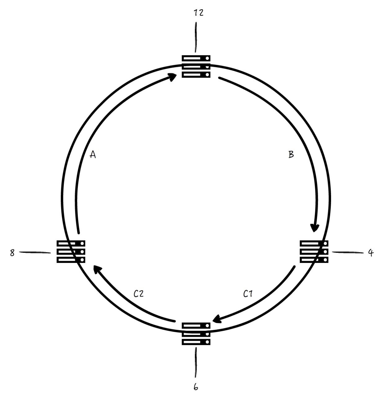 解决方法就是引入“虚拟节点”,我们根据时钟的 12 个数字,把它均匀分成 12 个区域,分别由 12 个虚拟节点负责,并且顺时针按照 Ax-Bx-Cx 这样命名。这样,在添加机器以前,每台机器需要负责4块数据(例如某台机器 A 需要承载 A1、A2、A3 和 A4 的数据),并且它们均匀地散布在圆环上: