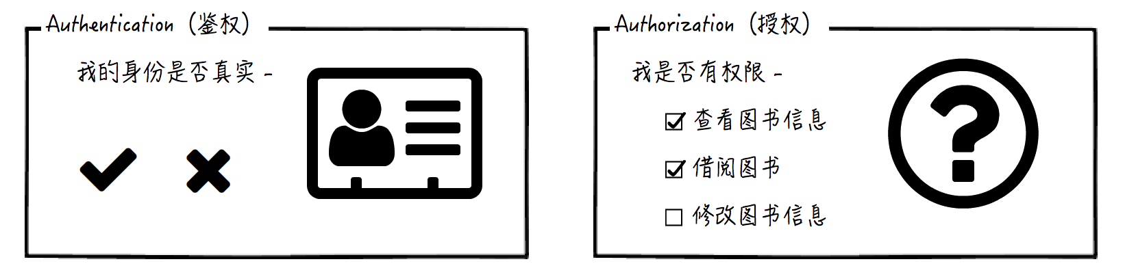 再来举个授权的例子。还记得我们在 [第 04 讲] 中介绍的“资源”吗?对于不同的资源,不同的用户拥有不同的权限,而授权根据权限配置,确定用户对特定的资源是否能执行特定的行为。比如说,我们提到过的图书馆系统,授权确定用户是否能够查看图书信息,是否能够修改图书信息等等。