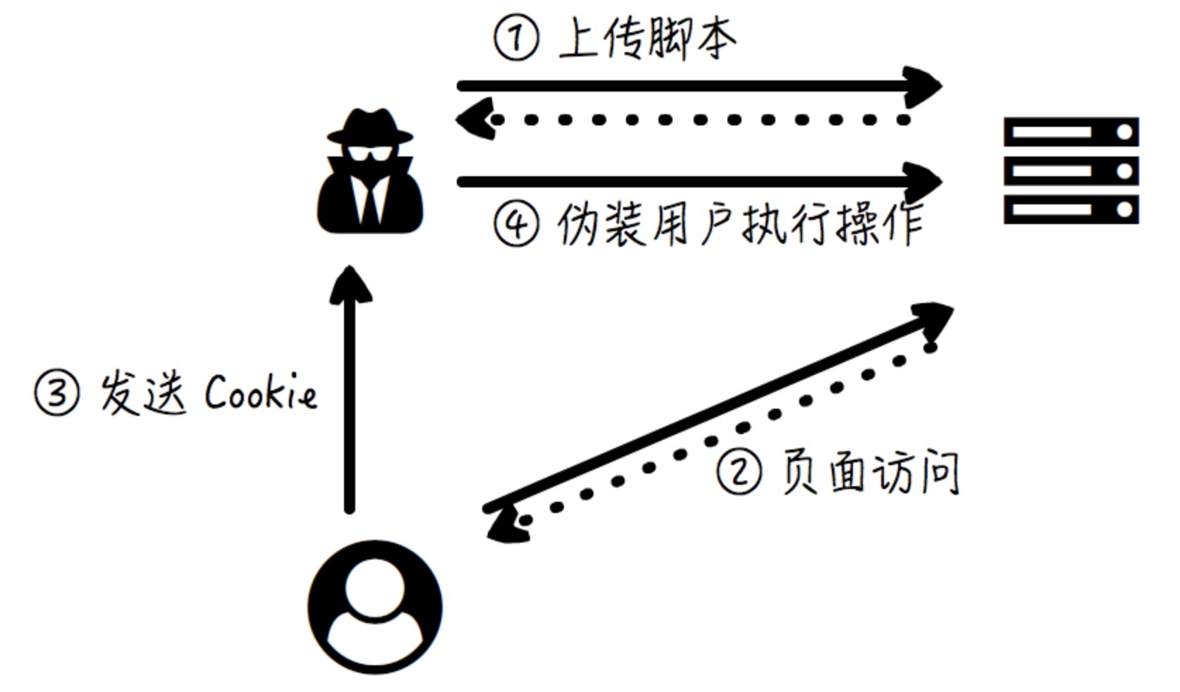 现在,攻击者在服务器返回的普通页面中嵌入特殊的脚本代码,那么在普通用户浏览这个网页的时候,这个特殊的脚本代码就得到了执行,于是用户的 Cookie 通过请求的方式发送给了这个攻击者指定的地址,这样攻击者就劫持了用户的会话,利用 Cookie 中标识身份的字符串,就可以伪装成实际的用户,来做各种坏事了。这个过程见下图: