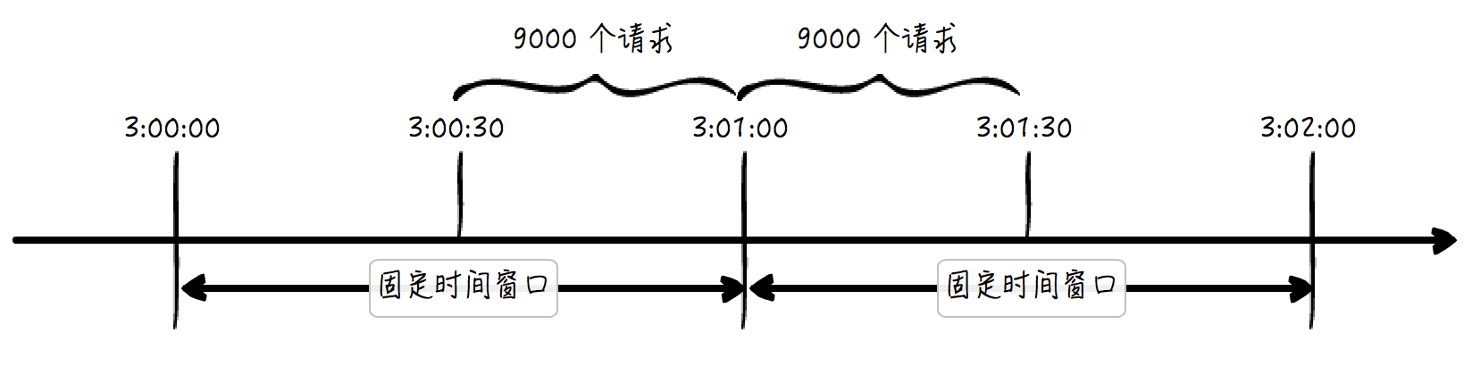 举个例子,从 3:00 到 3:01 这一分钟时间内,假如系统收到了 9000 个请求,而在 3:01 到 3:02 这接着的一分钟内,系统也收到了 9000 个请求,二者都满足要求。但是,这是我们给了一个假定的增强条件——固定时间窗口,而得到的结论。