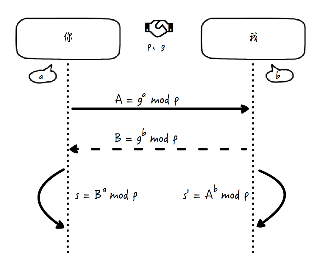 你看,整个过程中,只有 a、b 这两个数分别是你和我各自知道并保密的,而其它交换的数据全部都是公开的。对于你来说,已经有了 a,又得到我传过来的 B,于是你算出了 s;对于我来说,已经有了 b,又得到了你传过来的 A,于是我算出了 s’。