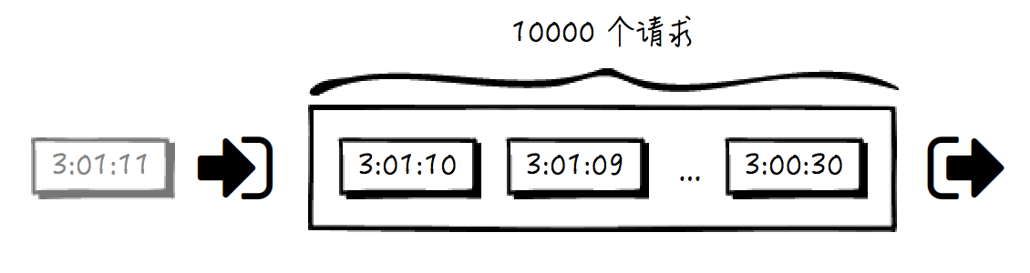 假如说前面这 9000 个请求都分布在 3:00:30 到 3:01:00 之间,后面这 9000 个请求都分布在 3:01:00 到 3:01:30 之间,即从 3 点 00 分 30 秒 到 3 点 01 分 30 秒这一分钟内,系统居然接纳了 9000 + 9000 = 18000 个请求。因此,如果我们考虑的是“滑动时间窗口”,这显然违背了我们的每分钟一万次最大请求量的规则。请看下图: