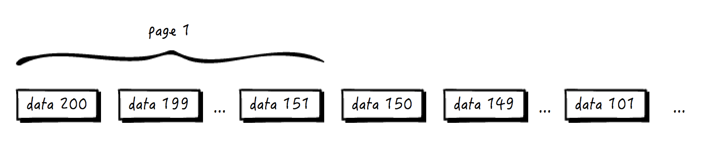 当然,只有一种例外,即只有用户访问第一页的时候(或者说,是用户的查询传入的“位置”参数为空的时候),才始终查询并返回最新的第一页数据。比如现在 data 200 已经添加进来了,查询第一页的时候就返回 data 151 到 data 200 这最新的 50 条数据: