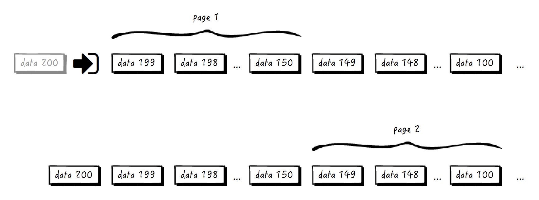 你看,用户刚访问的时候,返回了 data 150 到 data 199 这 50 条记录,并且记住了当前页尾的位置。用户再访问第二页的时候,其实已经有新的元素 data 200 加进来了,但是不管它,我们根据前一页的页尾的位置找到了第二页开头的位置,返回 data 100 到 data 149 这 50 条记录。