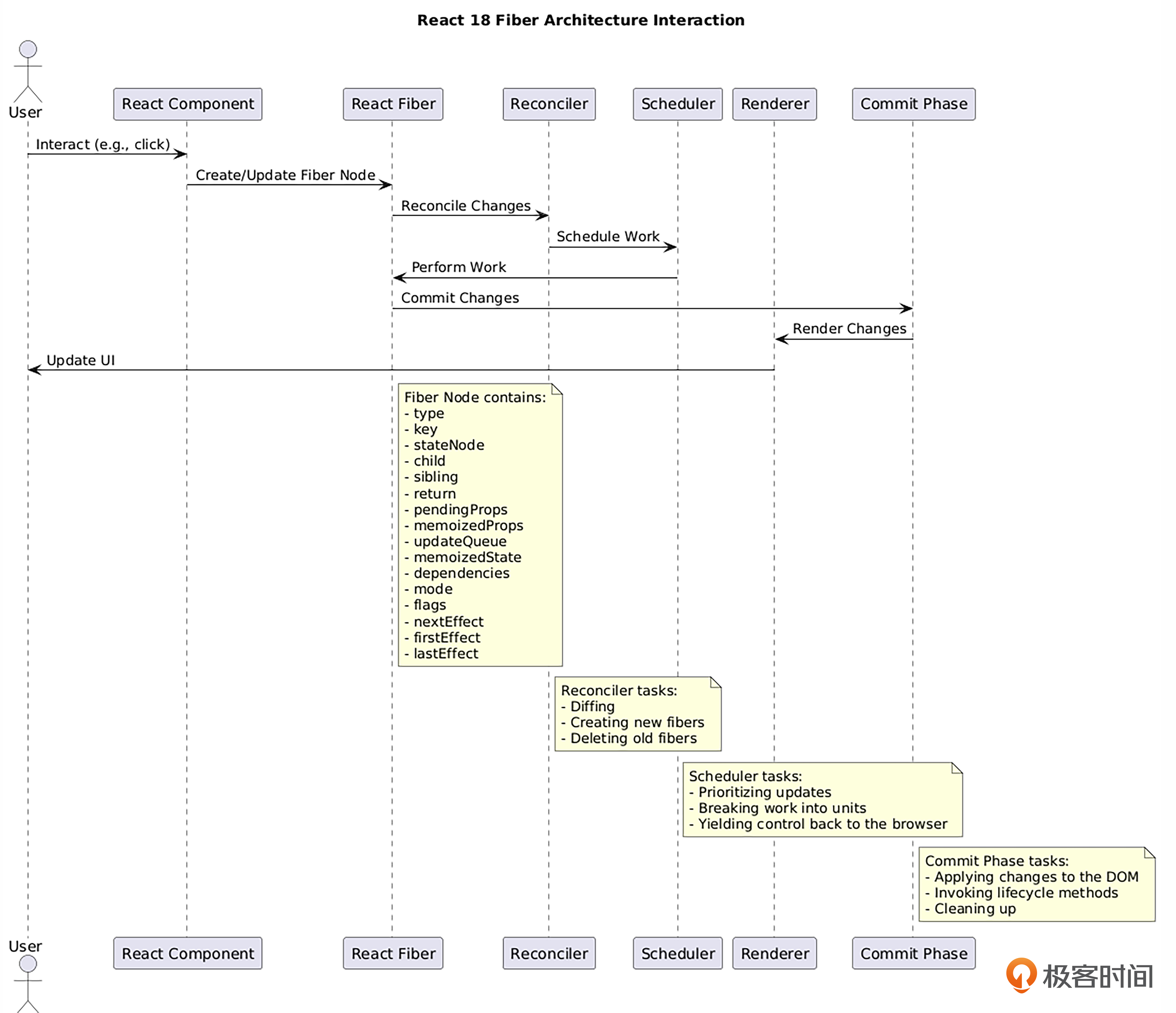 然后我们再简单了解一下Fiber架构。Fiber是React 16版本开始引入的一种新的内部架构,为了提高React的性能(特别是在动画、布局和手势等需要高响应性的应用中)。Fiber架构使得React可以将渲染工作分割成小的单位,实现任务的中断、重用和优先级排序。Fiber的实现原理可以参考协程原理。