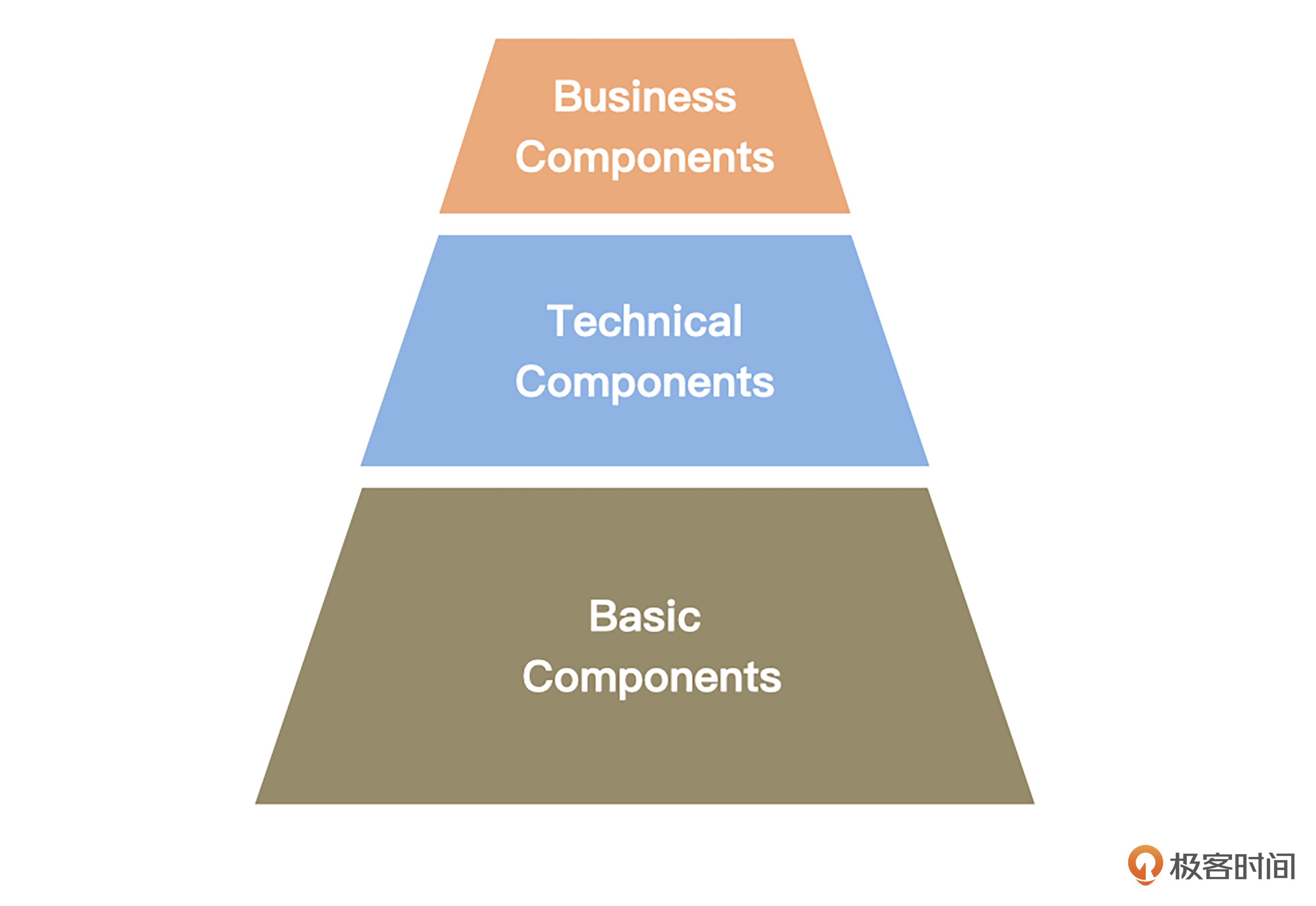 基于以上的设计原则和工程化要求,我们一般会将组件粒度划分为三层结构,基础组件、技术组件和业务组件。