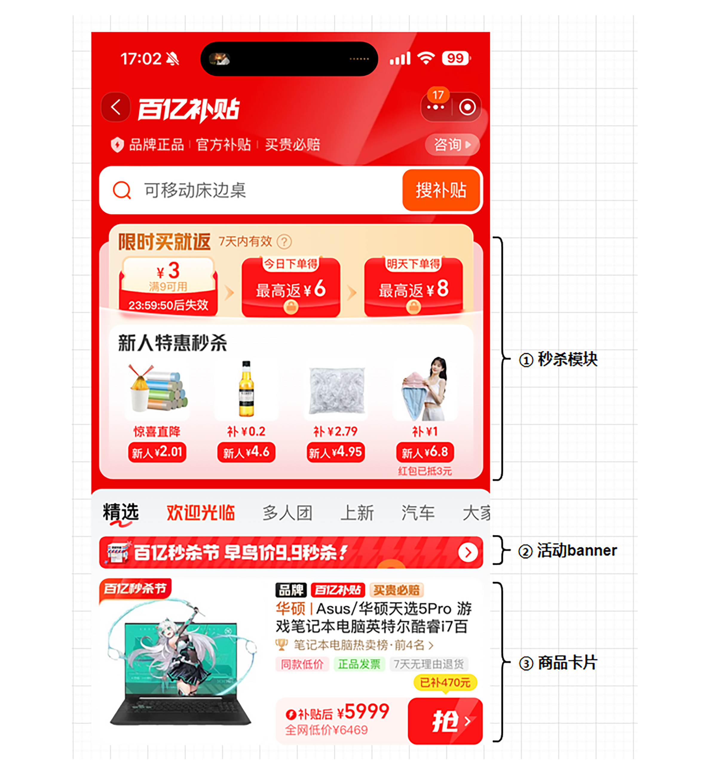比如电商环境的秒杀模块、活动banner商品卡片等。这类组件专门为秒杀和电商活动场景设计,非常贴近用户的使用习惯,且能够代表一定的数据结果。你可以参考后面这张图。