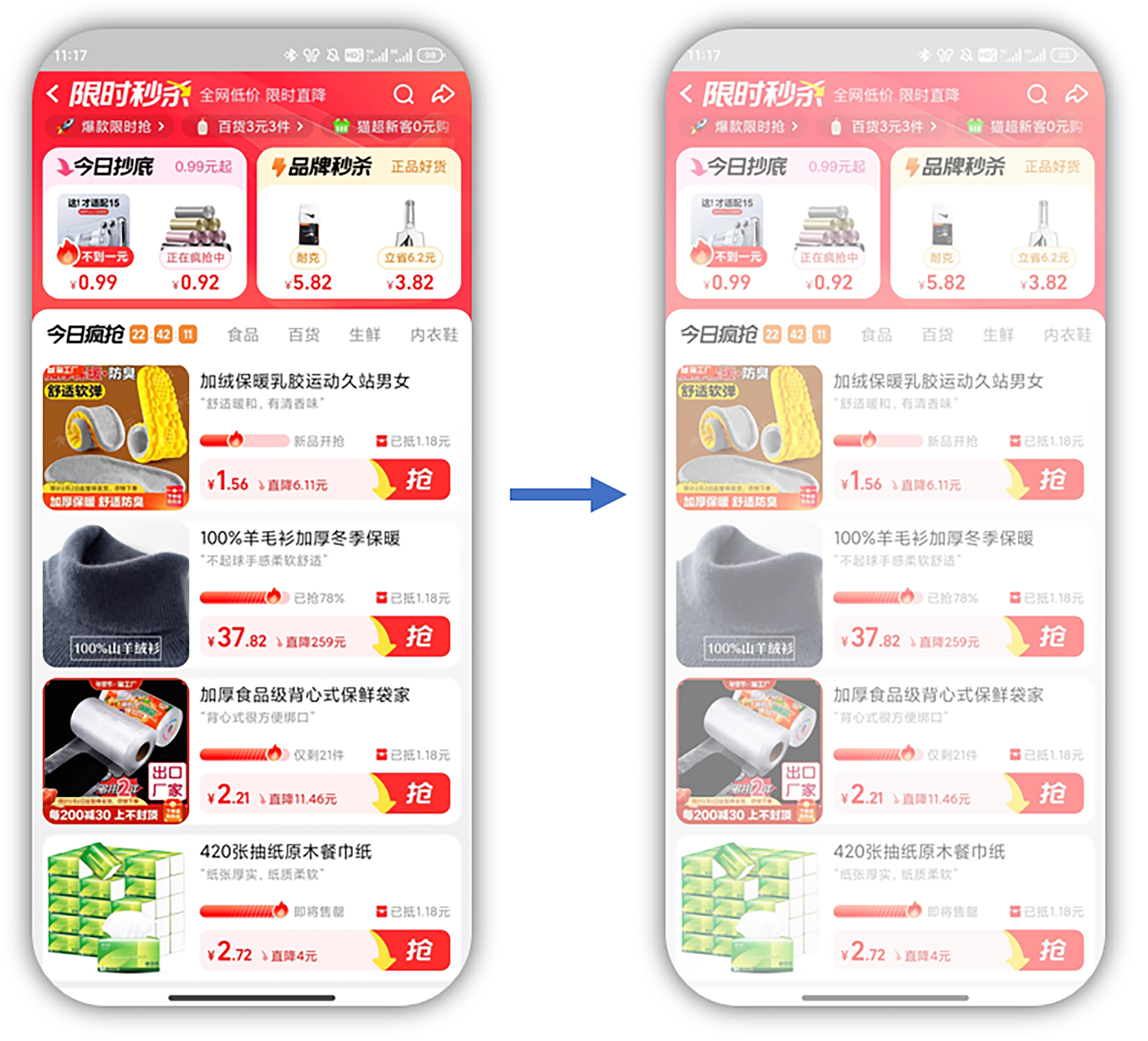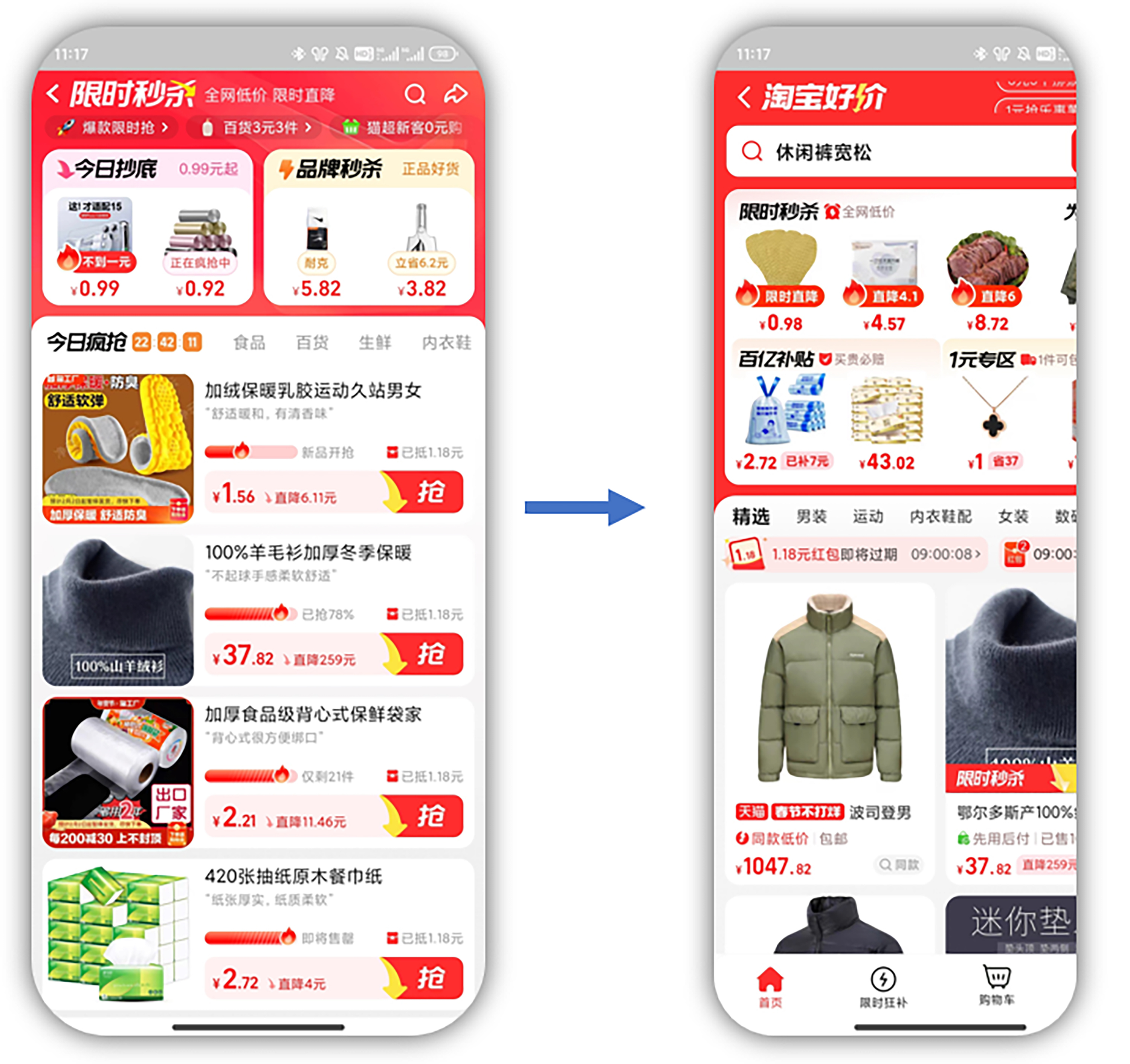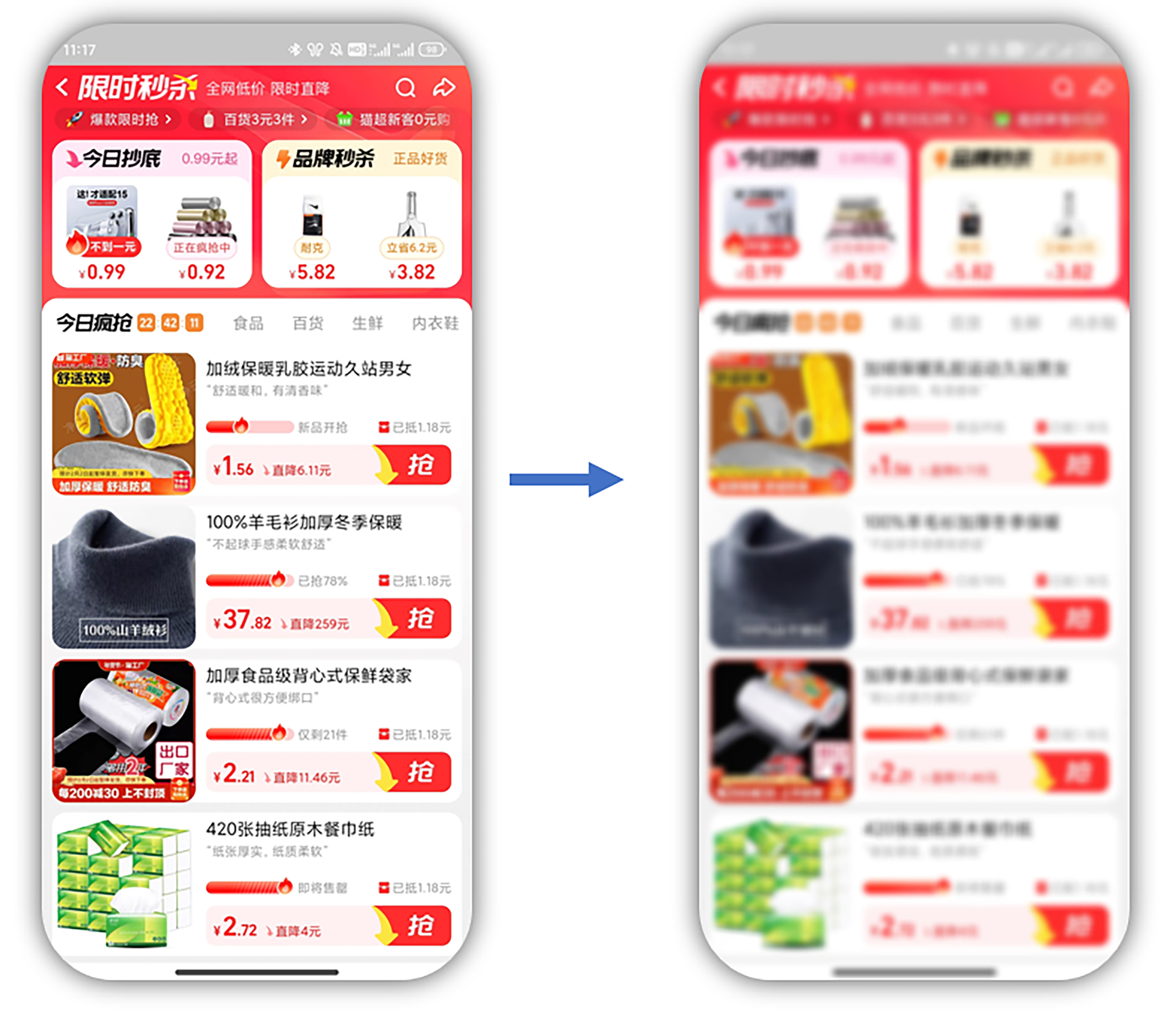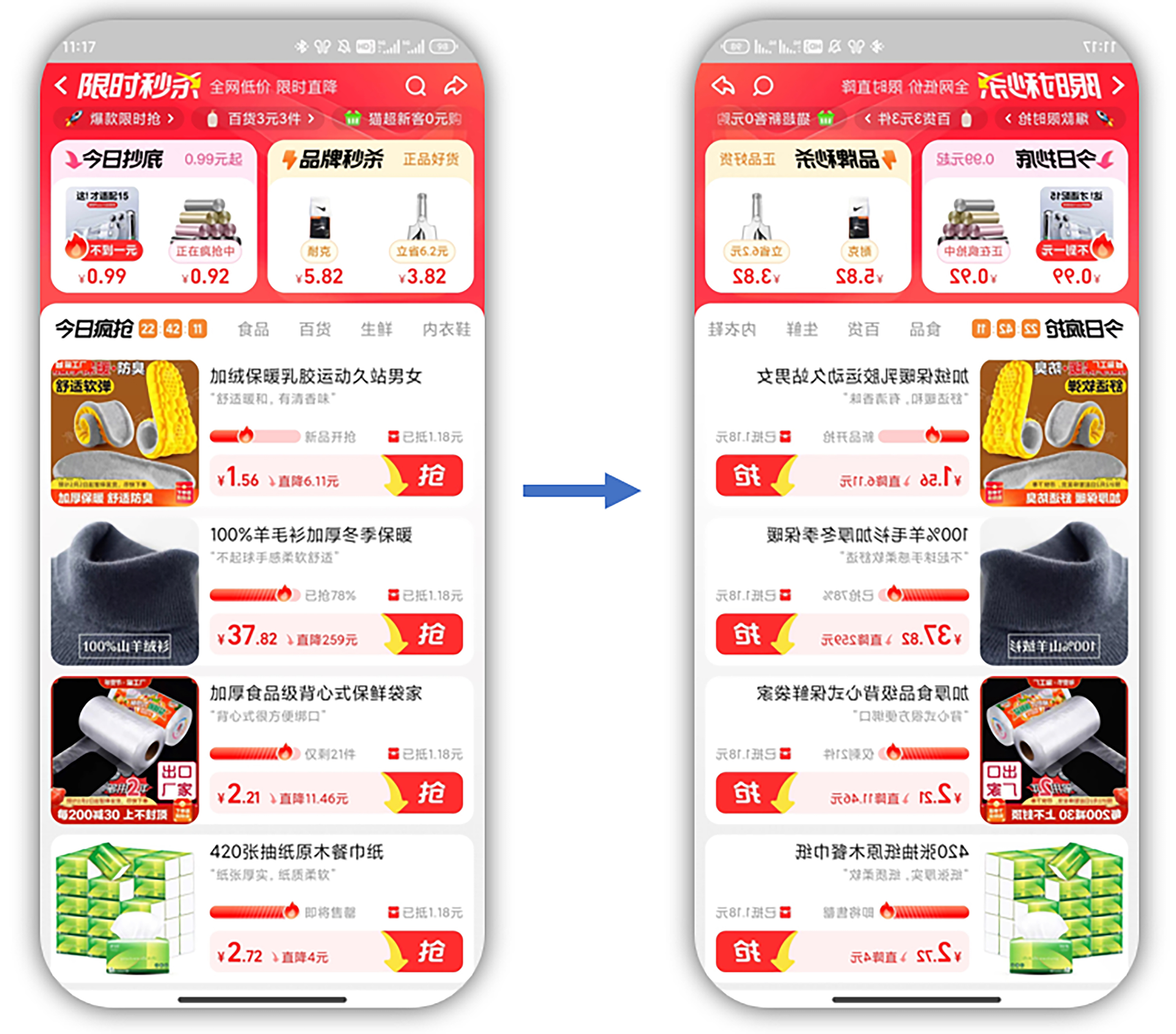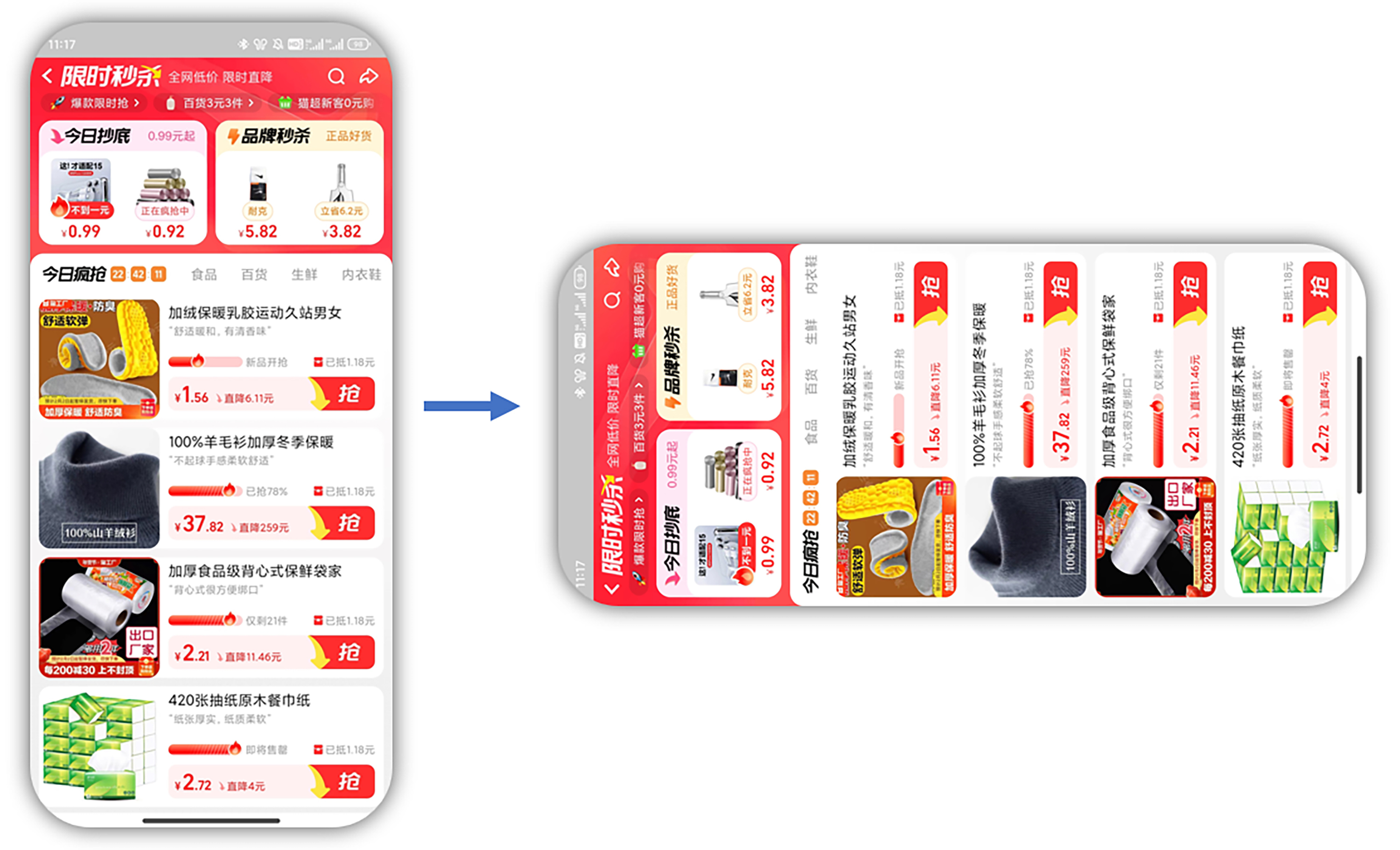 - 业务组件:如秒杀、百亿补贴、一元专区以及主商品Feeds流等模块,这些是与业务逻辑紧密相关的组件,包含了商品信息如商品图、商品标题以及用户心智标签等。