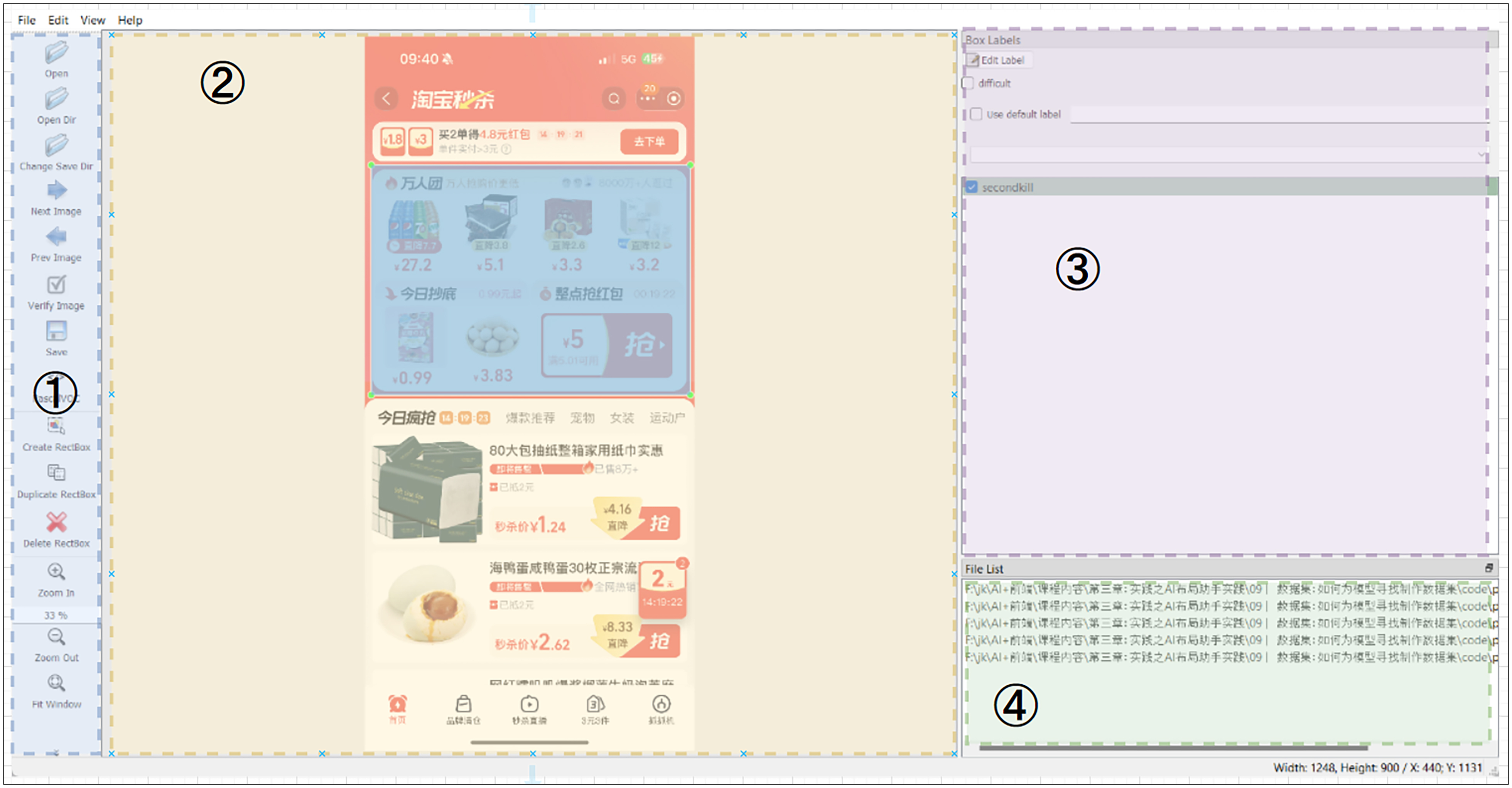 首先是做左边的标号 ① 的部分,这是一个竖直的操作栏。在这里我们可以选择打开一张图像或者是打开一组图像的目录,并选择保存的目录。同时我们可以选择创建标签框等操作。