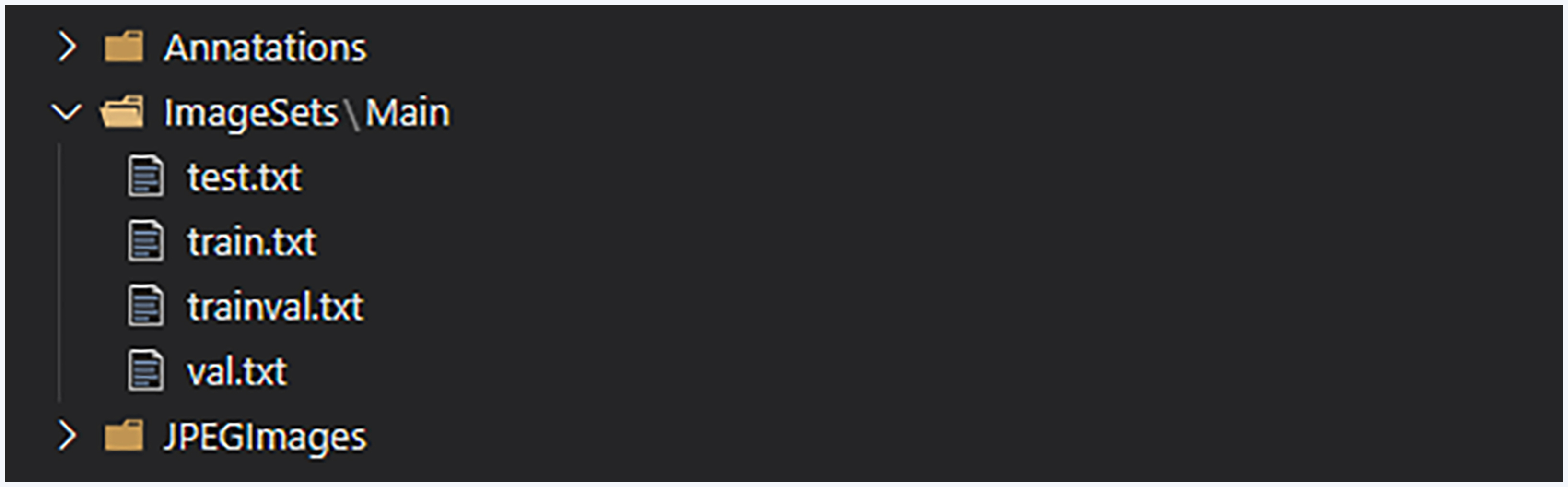 然后是图像集文件,存储在ImageSets/Main文件夹中,用于定义训练集、验证集和测试集。包括train.txt、val.txt和test.txt这样的文件,其中每行包含一个图像文件名,不带扩展名。