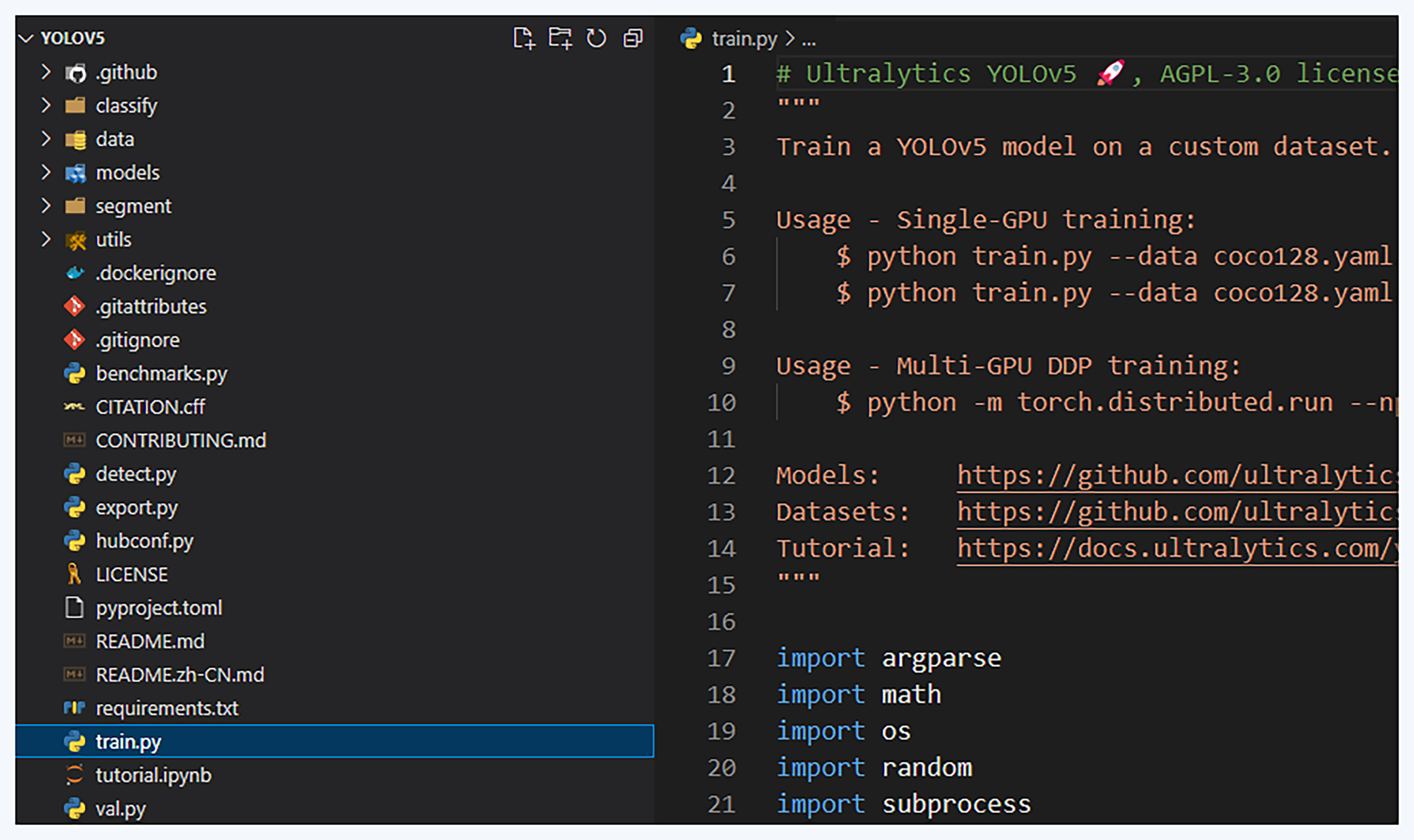我们来一起看一下需要我们关注和修改的几个文件。首先是根目录下的 train.py,这是模型训练的入。在train.py这个文件大概第560行左右的位置,会有一些使用argparse进行超参数设置的代码,需要我们根据先验知识进行设置。这里的先验知识通常来源于一些经典论文或者网络搜索,并在训练的过程中不断调整。
