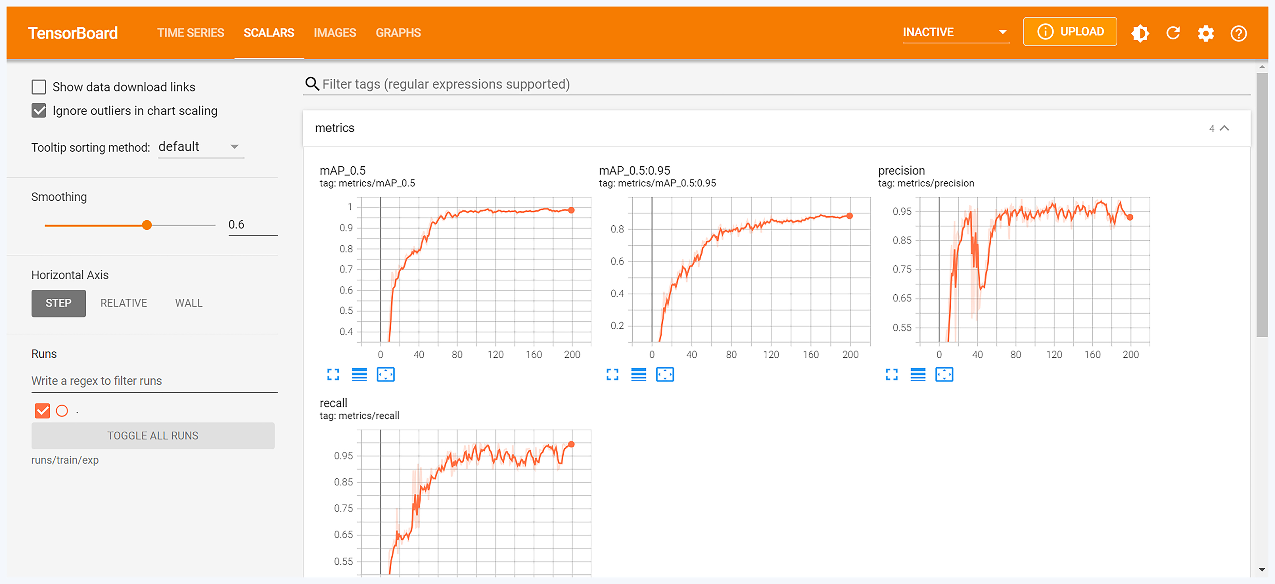 这里我们通过直接观察mAP值来判断了模型的训练效果。其实,对于YOLOv5的训练效果分析不仅通过mAP,还可以通过分析训练和验证损失、精度和召回率等指标来实现。我们可以通过这样一个命令打开一个本地服务,来查看和分析更多的训练结果指标。