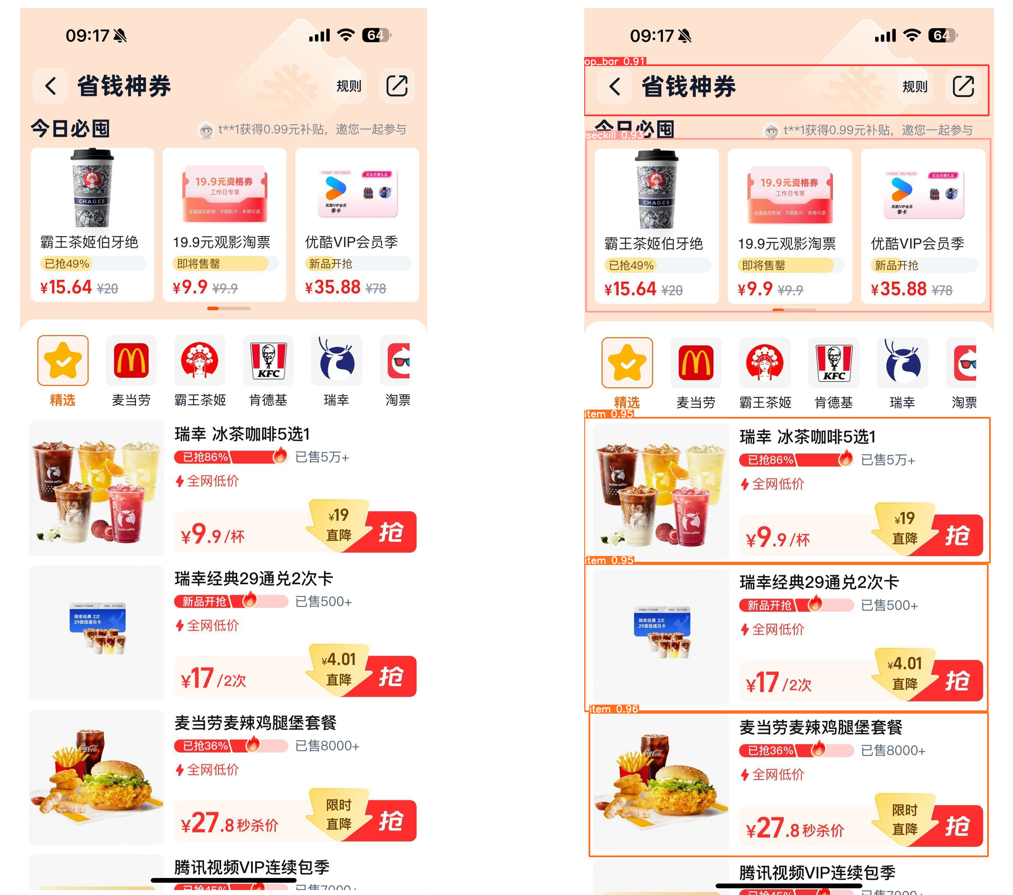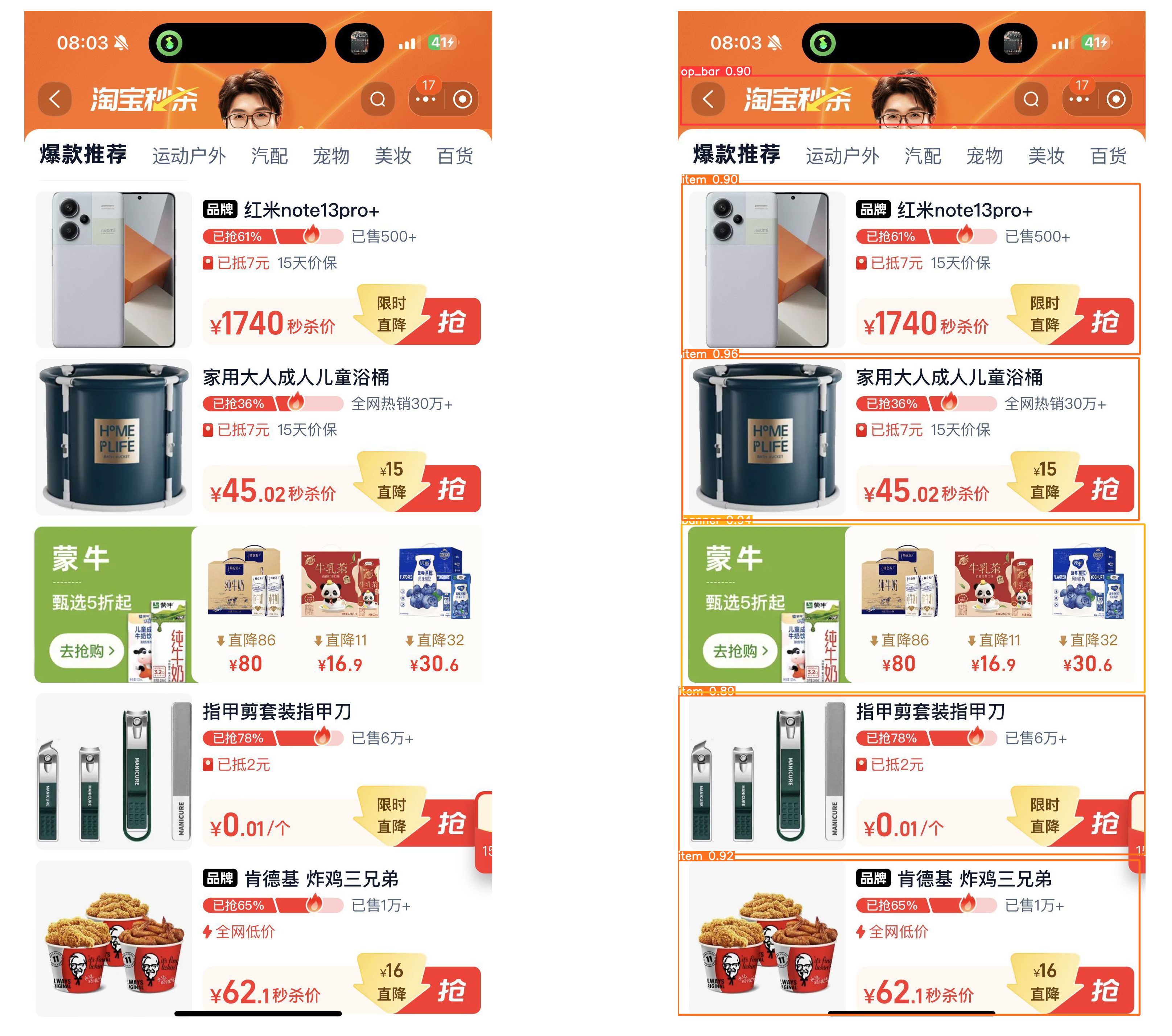 我们一起看看后面的例子,这样更直观。首先是可视化的一个检测结果,其中左侧为原图,右侧为检测结果图。可以看到 ,我们的模型/AI组件识别助手的识别效果还不错,两张图像里的组件类型和定位都识别得比较准确,也打上了对应的矩形框和类型分类。