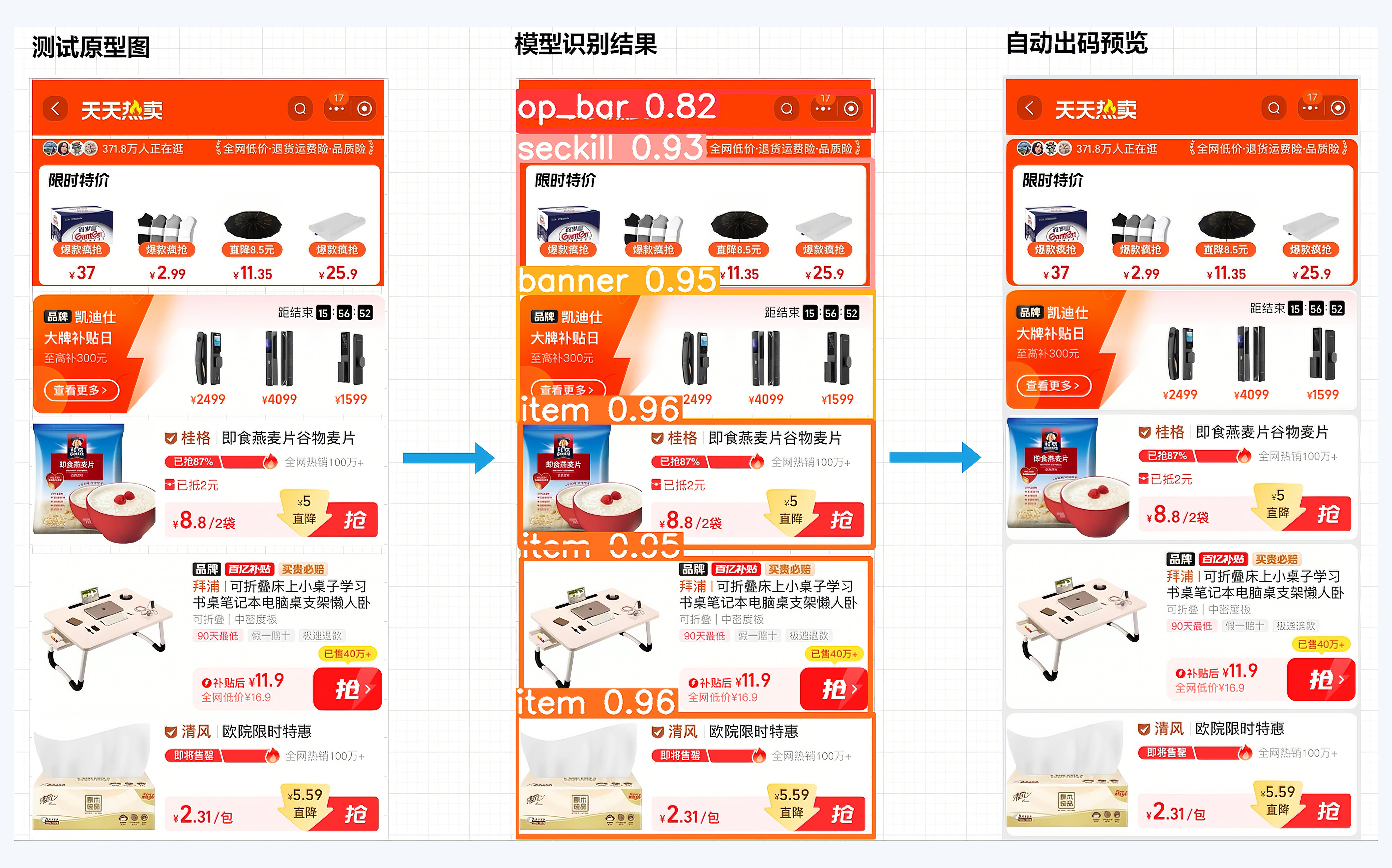 在这张模拟产品原型稿中,我按照模型训练时的组件分类类型,从上到下分别排列了操作栏(op_bar)、秒杀模块(seckill)、商品模块(item)、横幅模块(banner)、不同类型的商品模块(item)、商品模块(item)。我们需要将这张图像作为待识别数据放入 data/images 目录下,等待执行检测命令。