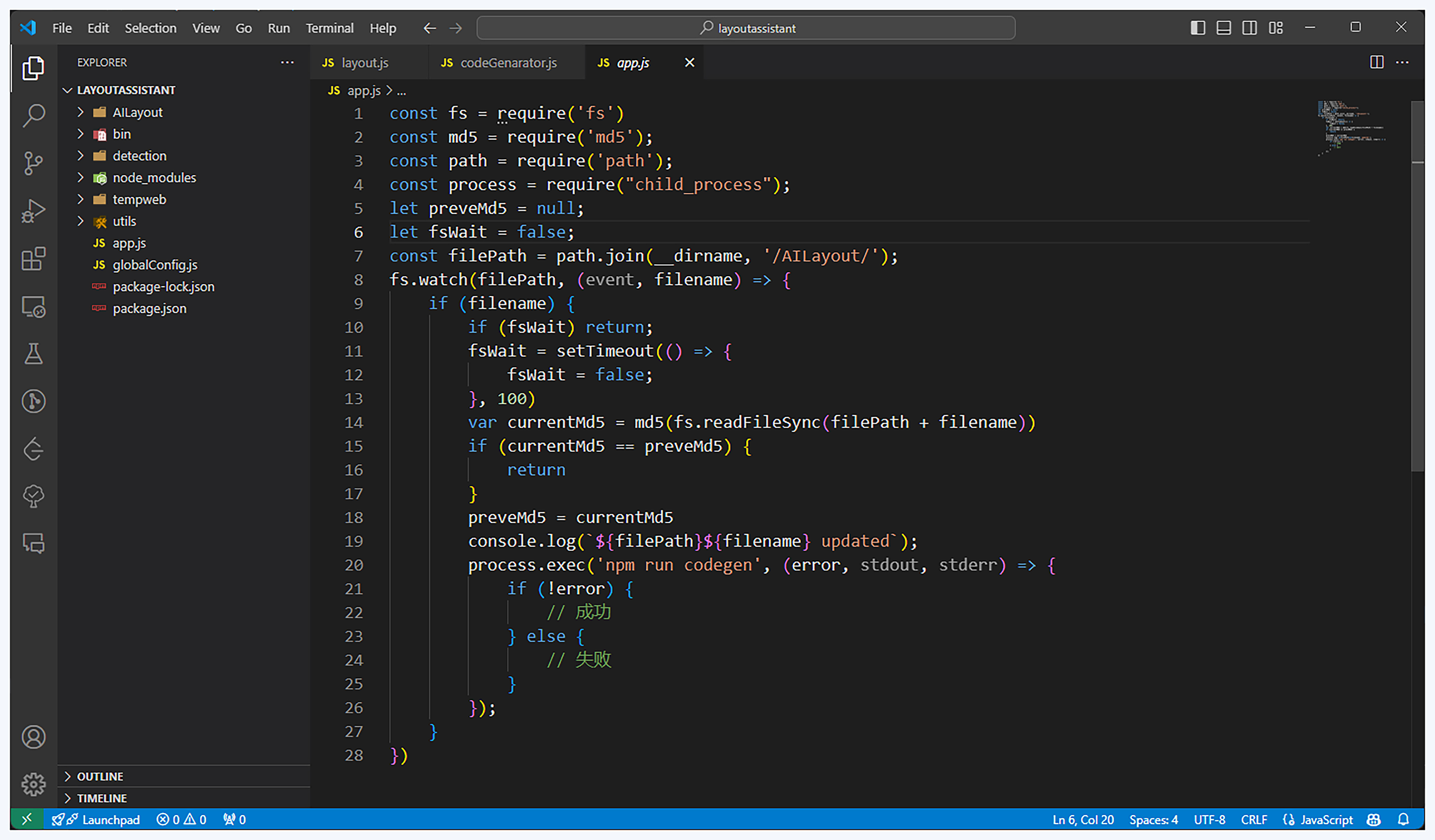 有了代码生成的核心逻辑,接下来我们就可以使用NodeJS的文件监听和文件写操作来自动生成代码了。在根目录下的app.js文件中,存放了监听文件内容变化的代码,在中间文件内容发生变化时,就能够自动执行代码生成的命令。