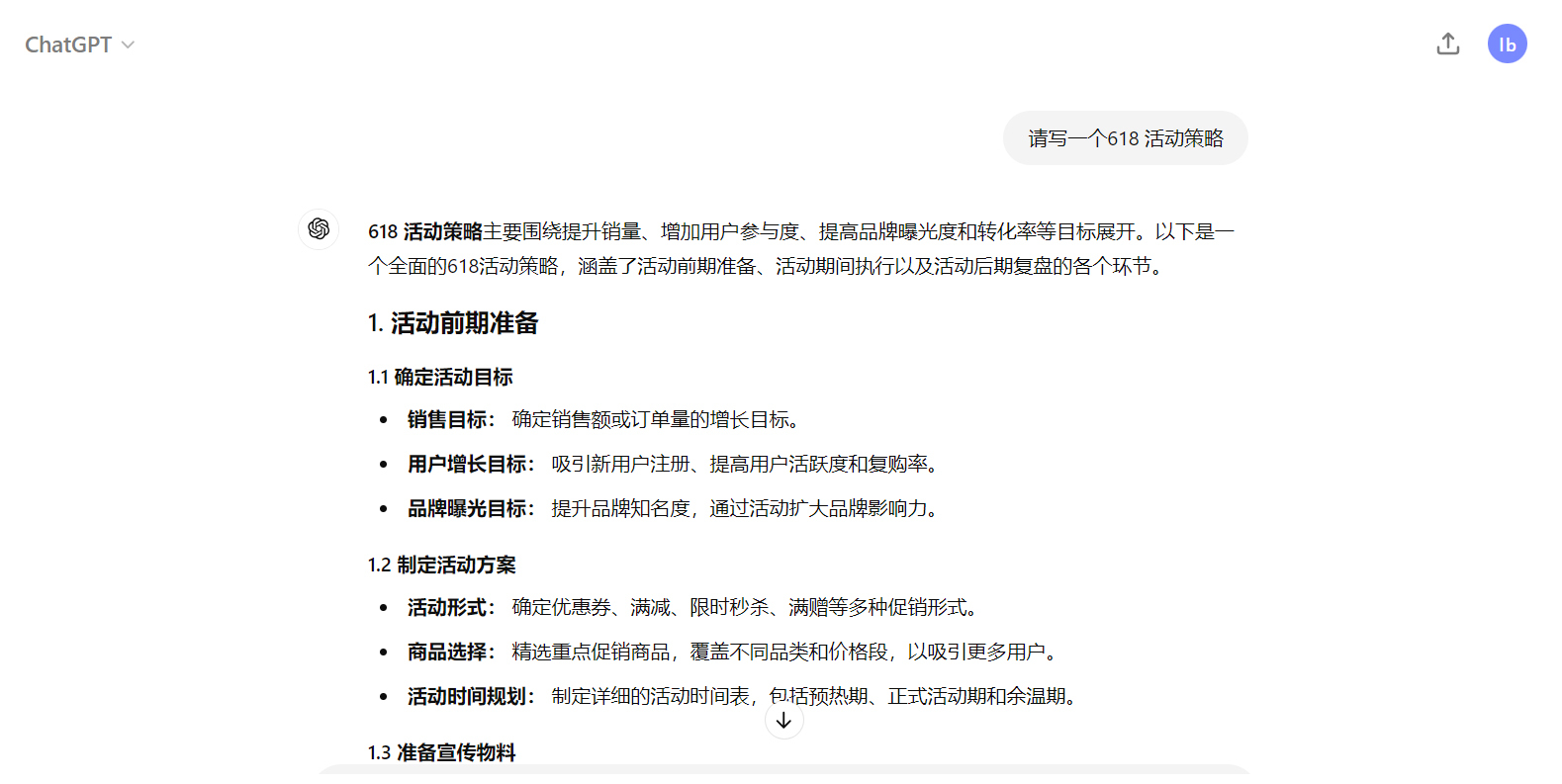 对业务同学来说,可以使用现在的文本大模型来进行生成式对话,比如,让ChatGPT为电商618活动提供一段产品策略。