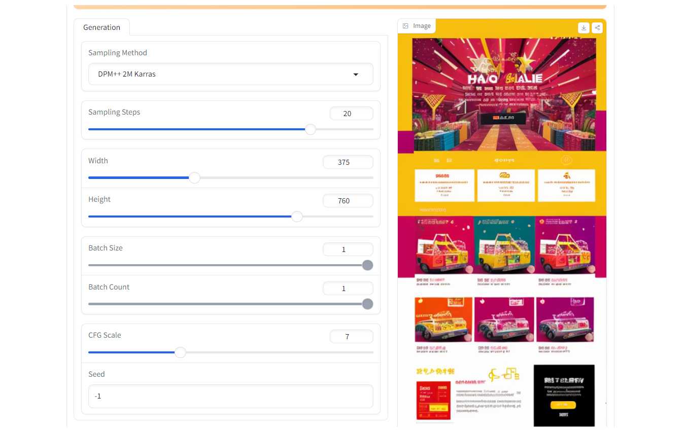 我们使用在线的Stable Diffusion服务,输入这段提示词,就生成了后面的H5页面设计图像。