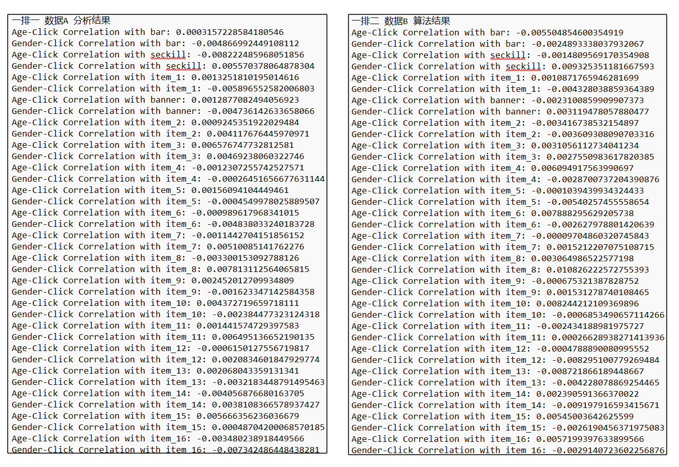 在这个过程中,我们需要先完成数据的预处理,将数据中的性别、年龄和点击行为映射为数值特征,然后计算每个属性和点击行为之间的皮尔逊相关系数。