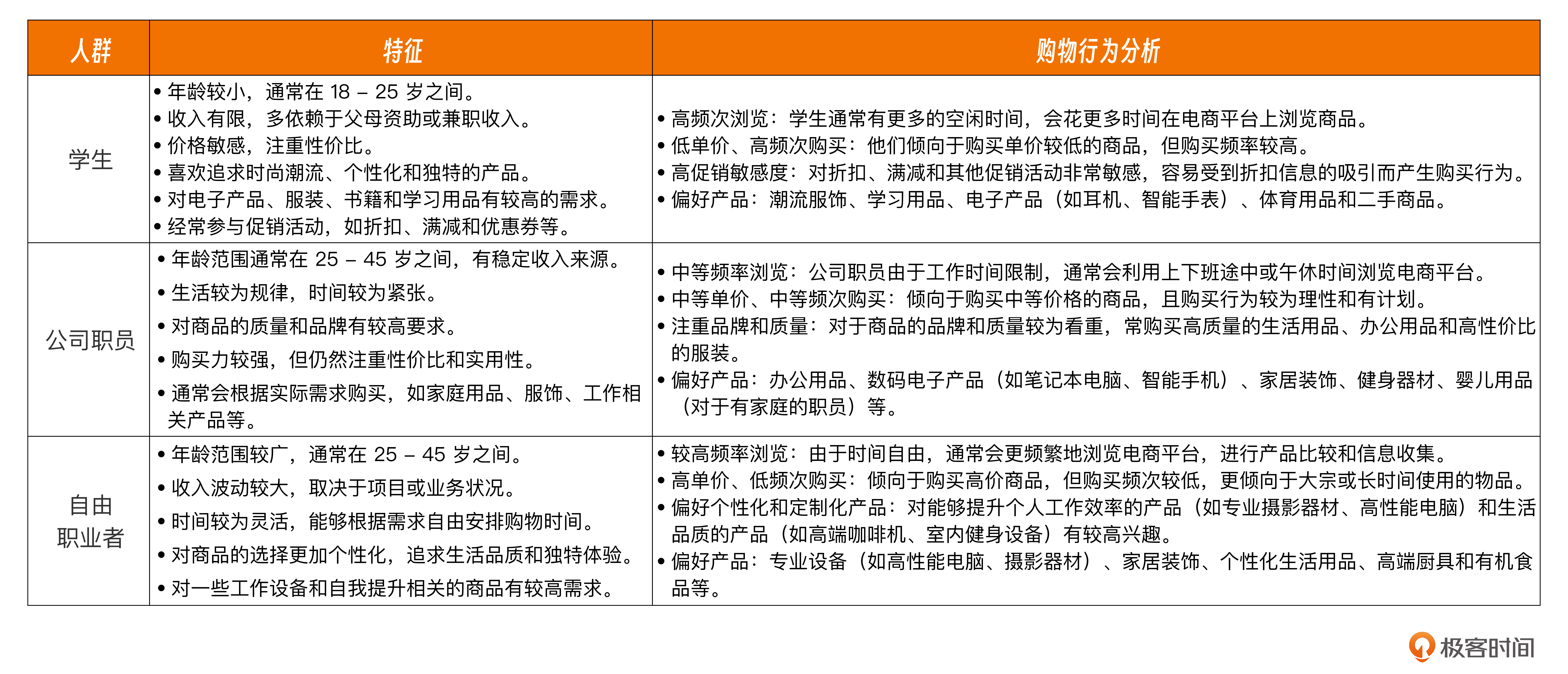 Q:这节课里我们将用户年龄作为关键指标,分析了不同年龄段用户的特质。那么以职业(学生,公司职员,自由职业)来划分用户的话,你觉得会找到哪些特征呢?
