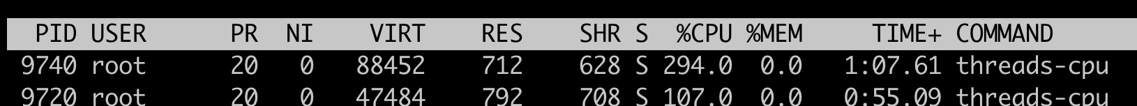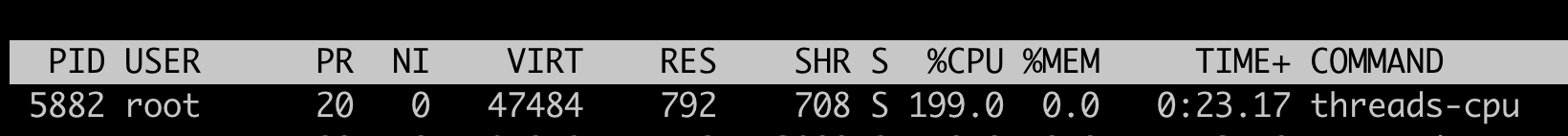 在我们没有修改cpu.cfs_quota_us前,用top命令可以看到threads-cpu这个进程的CPU 使用是199%,近似2个CPU。