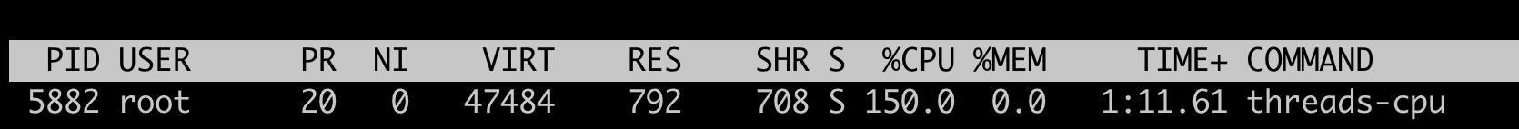 这时候我们再运行top,就会发现threads-cpu进程的CPU使用减小到了150%。这是因为我们设置的cpu.cfs_quota_us起了作用,限制了进程CPU的绝对值。