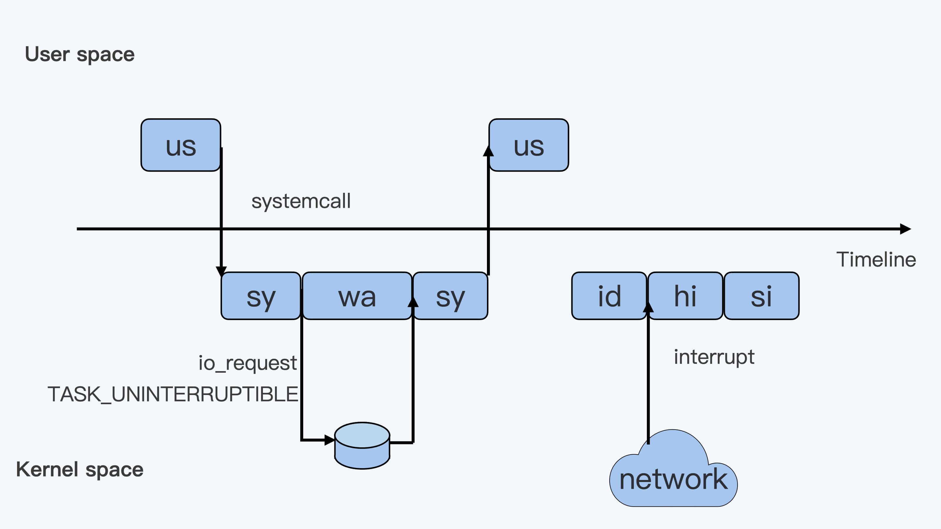 内核态read()系统调用在读到真正disk上的文件前,就会进行一些文件系统层的操作。那么这些代码指令的消耗就属于"sy",这里就对应上面图里的第二个框。"sy"是 "system"的缩写,代表内核态CPU使用。