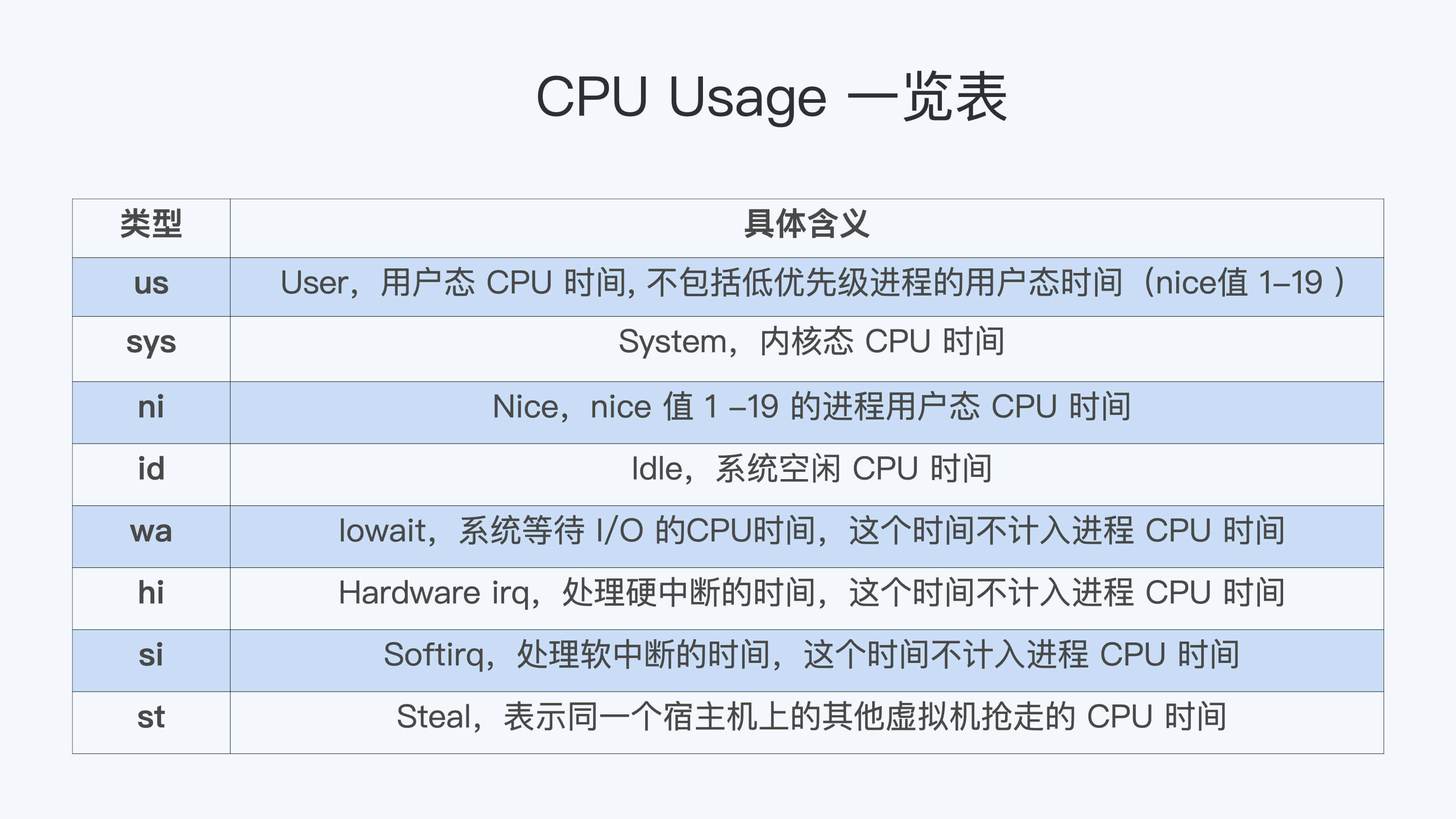 另外一个是"st","st"是"steal"的缩写,是在虚拟机里用的一个CPU使用类型,表示有多少时间是被同一个宿主机上的其他虚拟机抢走的。