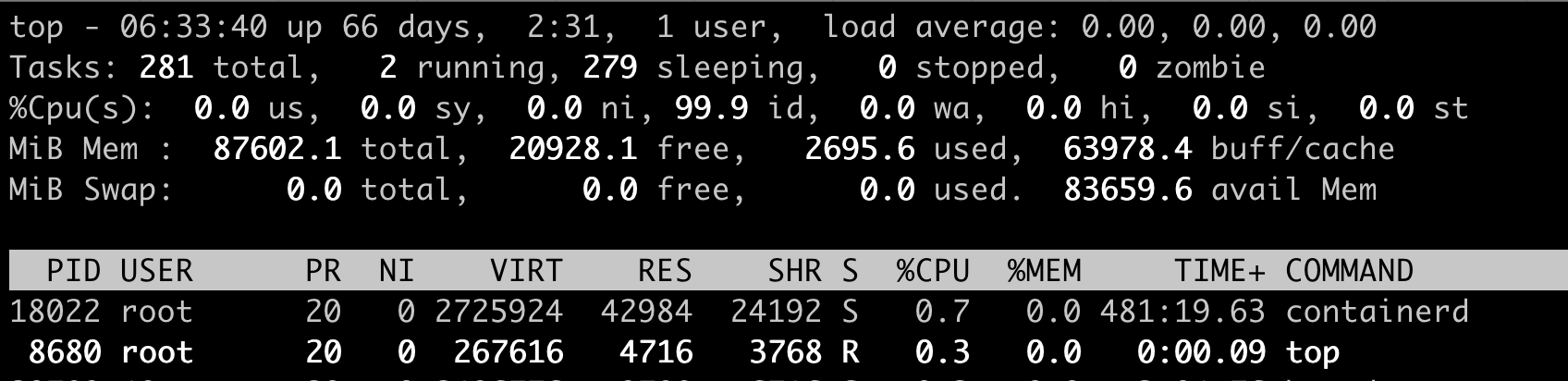 我们对照下图的Top运行界面,在截图第三行,"%Cpu(s)"开头的这一行,你会看到一串数值,也就是"0.0 us, 0.0 sy, 0.0 ni, 99.9 id, 0.0 wa, 0.0 hi, 0.0 si, 0.0 st",那么这里的每一项值都是什么含义呢?