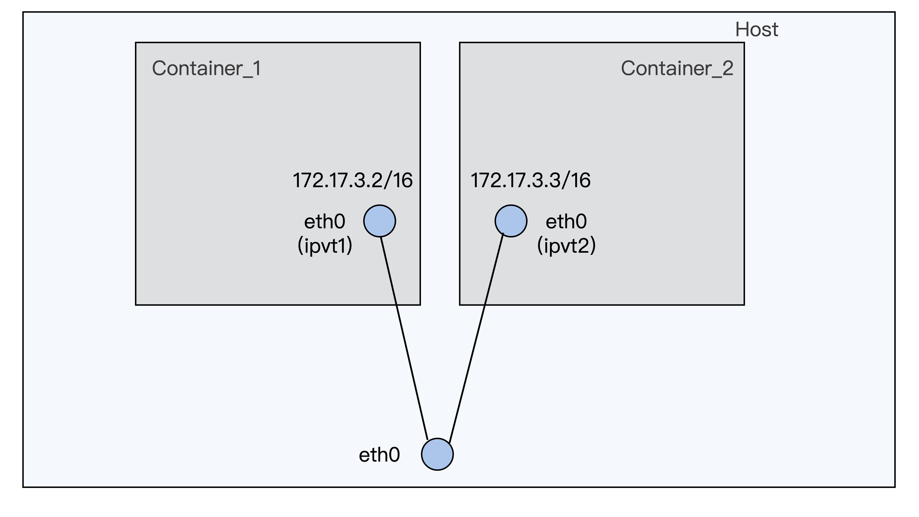 两个容器配置好之后,就像下面图中描述的一样了。从这张图里,你很容易就能看出macvlan/ipvlan与veth网络配置有什么不一样。容器的虚拟网络接口,直接连接在了宿主机的物理网络接口上了,形成了一个网络二层的连接。