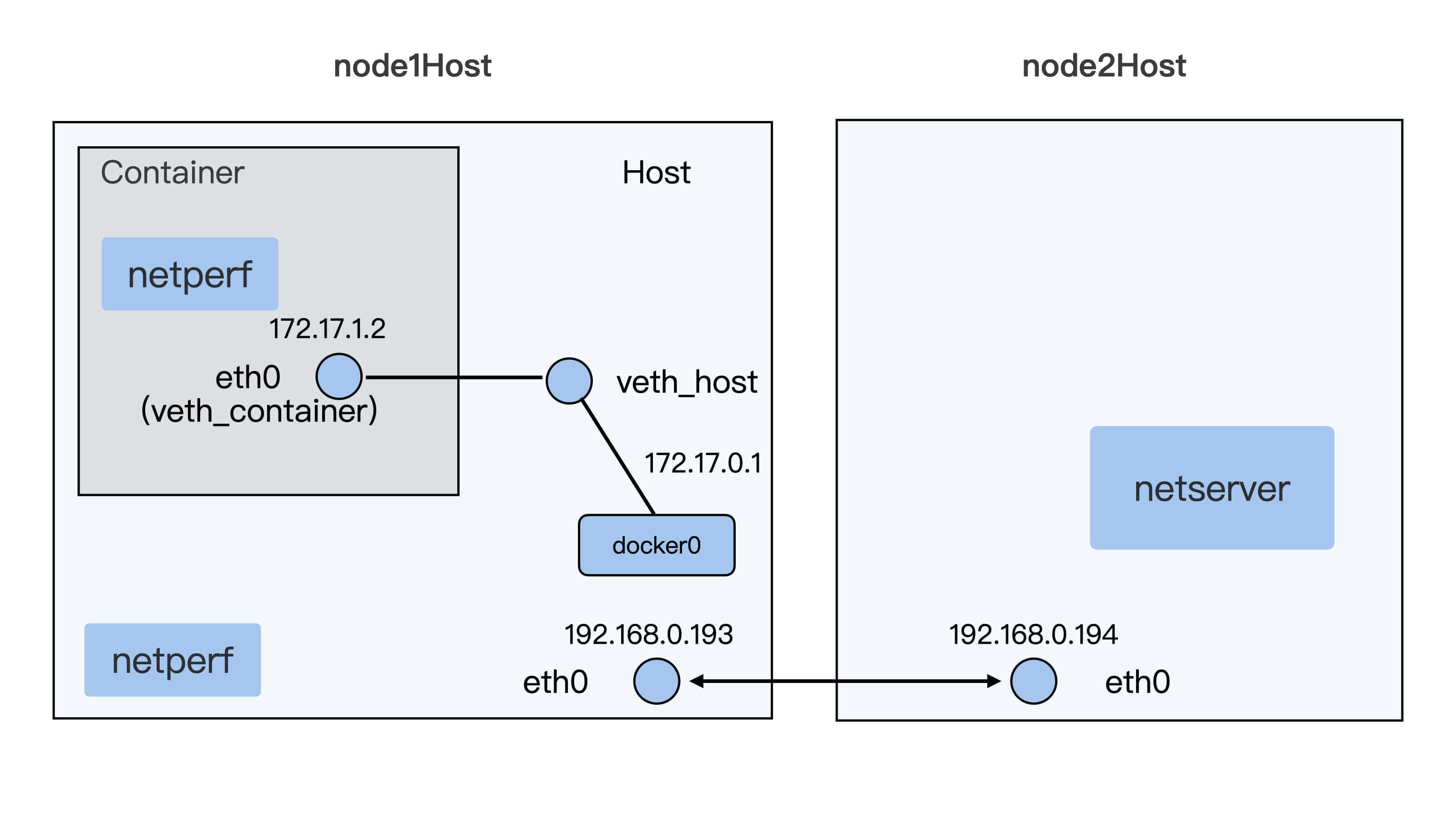 首先,我们需要在第一台机器上启动一个veth接口的容器,容器的启动和宿主机上的配置你可以参考一下这里的脚本。在第二台机器上,我们只要启动一个netserver就可以了。